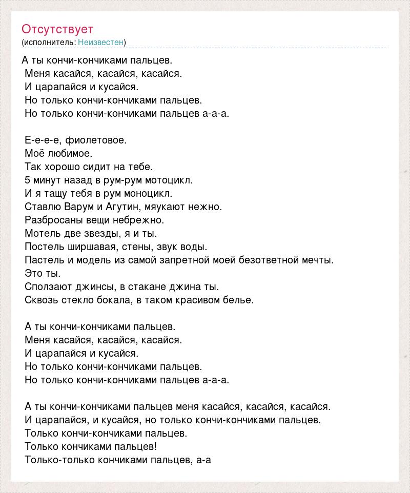 А ты кончи-кончиками пальцев. Меня касайся, касайся, касайся. И царапайся и кусайся. Но только кончи-кончиками пальцев. Но только кончи-кончиками пальцев а-а-а. Е-е-е-е, фиолетовое. Моё любимое. Так хорошо сидит на тебе. 5 минут назад в рум-рум мотоцикл. И я тащу тебя в рум моноцикл. Ставлю Варум и Агутин, мяукают нежно. Разбросаны вещи небрежно. Мотель две звезды, я и ты. Постель ширшавая, стены, звук воды. Пастель и модель из самой запретной моей безответной мечты. Это ты. Сползают джинсы, в стакане джина ты. Сквозь стекло бокала, в таком красивом белье. А ты кончи-кончиками пальцев. Меня касайся, касайся, касайся. И царапайся и кусайся. Но только кончи-кончиками пальцев. Но только кончи-кончиками пальцев а-а-а. А ты кончи-кончиками пальцев меня касайся, касайся, касайся. И царапайся, и кусайся, но только кончи-кончиками пальцев. Только кончи-кончиками пальцев. Только кончиками пальцев! Только-только кончиками пальцев, а-а