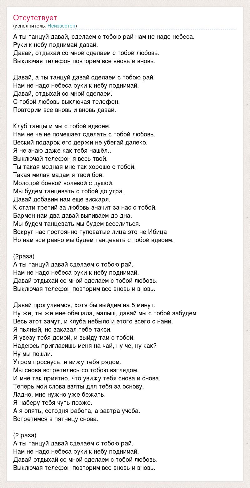 А ты танцуй давай, сделаем с тобою рай нам не надо небеса. Руки к небу поднимай давай. Давай, отдыхай со мной сделаем с тобой любовь. Выключая телефон повторим все вновь и вновь. Давай, а ты танцуй давай сделаем с тобою рай. Нам не надо небеса руки к небу поднимай. Давай, отдыхай со мной сделаем. С тобой любовь выключая телефон. Повторим все вновь и вновь давай. Клуб танцы и мы с тобой вдвоем. Нам не че не помешает сделать с тобой любовь. Веский подарок его держи не убегай далеко. Я не знаю даже как тебя нашёл.. Выключай телефон я весь твой. Ты такая модная мне так хорошо с тобой. Такая милая мадам я твой бой. Молодой боевой волевой с душой. Мы будем танцевать с тобой до утра. Давай добавим нам еще вискаря. К стати третий за любовь значит за нас с тобой. Бармен нам два давай выпиваем до дна. Мы будем танцевать мы будем веселиться. Вокруг нас постоянно туповатые лица это не Ибица Но нам все равно мы будем танцевать с тобой вдвоем. (2раза) А ты танцуй давай сделаем с тобою рай. Нам не надо небеса руки к небу поднимай. Давай отдыхай со мной сделаем с тобой любовь. Выключая телефон повторим все вновь и вновь. Давай прогуляемся, хотя бы выйдем на 5 минут. Ну же, ты же мне обещала, малыш, давай мы с тобой забудем Весь этот замут, и клуба небыло и этого всего с нами. Я пьяный, но заказал тебе такси. Я увезу тебя домой, и выйду там с тобой. Надеюсь пригласишь меня на чай, ну че, ну как? Ну мы пошли. Утром проснусь, и вижу тебя рядом. Мы снова встретились со тобою взглядом. И мне так приятно, что увижу тебя снова и снова. Теперь мои слова взяты для тебя за основу. Ладно, мне нужно уже бежать. Я наберу тебя чуть позже. А я опять, сегодня работа, а завтра учеба. Встретимся в пятницу снова. (2 раза) А ты танцуй давай сделаем с тобою рай. Нам не надо небеса руки к небу поднимай. Давай отдыхай со мной сделаем с тобой любовь. Выключая телефон повторим все вновь и вновь.