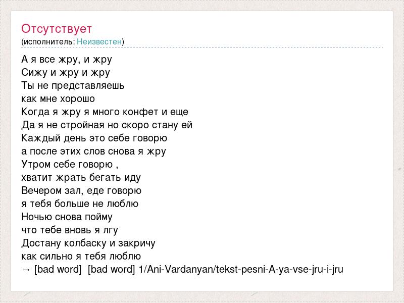 А я все жру, и жру Сижу и жру и жру Ты не представляешь как мне хорошо Когда я жру я много конфет и еще Да я не стройная но скоро стану ей Каждый день это себе говорю а после этих слов снова я жру Утром себе говорю , хватит жрать бегать иду Вечером зал, еде говорю я тебя больше не люблю Ночью снова пойму что тебе вновь я лгу Достану колбаску и закричу как сильно я тебя люблю → [bad word] [bad word] 1/Ani-Vardanyan/tekst-pesni-A-ya-vse-jru-i-jru