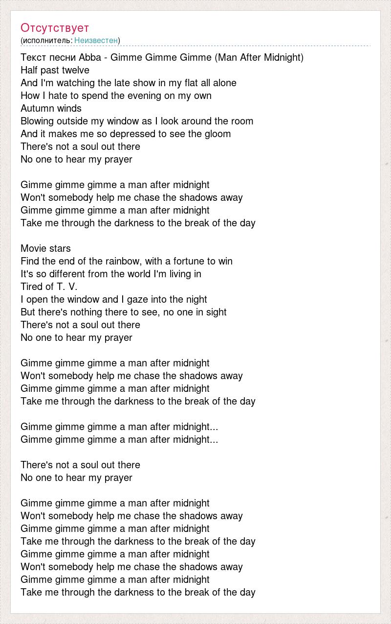 Текст песни Abba - Gimme Gimme Gimme (Man After Midnight) Half past twelve And I'm watching the late show in my flat all alone How I hate to spend the evening on my own Autumn winds Blowing outside my window as I look around the room And it makes me so depressed to see the gloom There's not a soul out there No one to hear my prayer Gimme gimme gimme a man after midnight Won't somebody help me chase the shadows away Gimme gimme gimme a man after midnight Take me through the darkness to the break of the day Movie stars Find the end of the rainbow, with a fortune to win It's so different from the world I'm living in Tired of T. V. I open the window and I gaze into the night But there's nothing there to see, no one in sight There's not a soul out there No one to hear my prayer Gimme gimme gimme a man after midnight Won't somebody help me chase the shadows away Gimme gimme gimme a man after midnight Take me through the darkness to the break of the day Gimme gimme gimme a man after midnight... Gimme gimme gimme a man after midnight... There's not a soul out there No one to hear my prayer Gimme gimme gimme a man after midnight Won't somebody help me chase the shadows away Gimme gimme gimme a man after midnight Take me through the darkness to the break of the day Gimme gimme gimme a man after midnight Won't somebody help me chase the shadows away Gimme gimme gimme a man after midnight Take me through the darkness to the break of the day