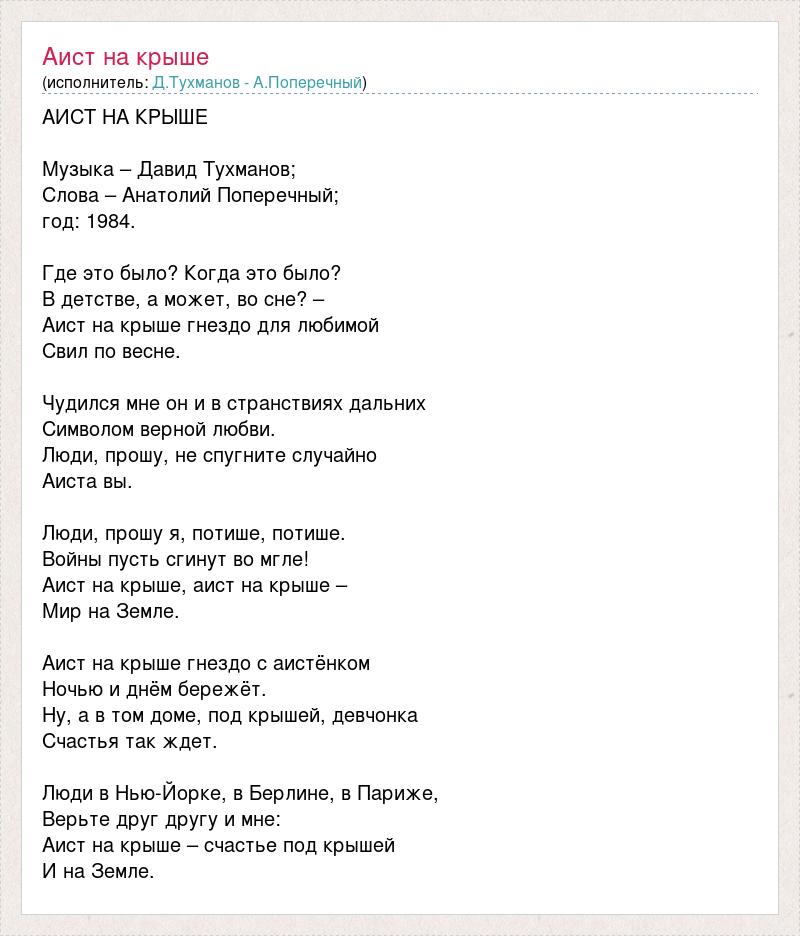 АИСТ НА КРЫШЕ Музыка – Давид Тухманов; Слова – Анатолий Поперечный; год: 1984. Где это было? Когда это было? В детстве, а может, во сне? – Аист на крыше гнездо для любимой Свил по весне. Чудился мне он и в странствиях дальних Символом верной любви. Люди, прошу, не спугните случайно Аиста вы. Люди, прошу я, потише, потише. Войны пусть сгинут во мгле! Аист на крыше, аист на крыше – Мир на Земле. Аист на крыше гнездо с аистёнком Ночью и днём бережёт. Ну, а в том доме, под крышей, девчонка Счастья так ждет. Люди в Нью-Йорке, в Берлине, в Париже, Верьте друг другу и мне: Аист на крыше – счастье под крышей И на Земле.