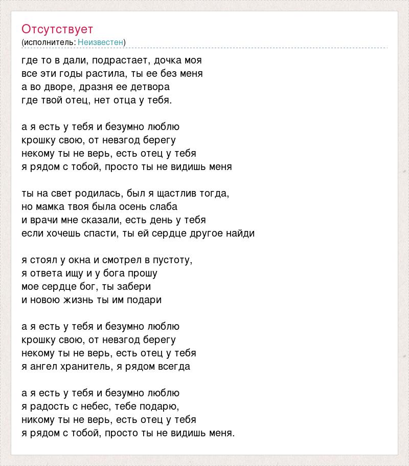 где то в дали, подрастает, дочка моя все эти годы растила, ты ее без меня а во дворе, дразня ее детвора где твой отец, нет отца у тебя. а я есть у тебя и безумно люблю крошку свою, от невзгод берегу некому ты не верь, есть отец у тебя я рядом с тобой, просто ты не видишь меня ты на свет родилась, был я щастлив тогда, но мамка твоя была осень слаба и врачи мне сказали, есть день у тебя если хочешь спасти, ты ей сердце другое найди я стоял у окна и смотрел в пустоту, я ответа ищу и у бога прошу мое сердце бог, ты забери и новою жизнь ты им подари а я есть у тебя и безумно люблю крошку свою, от невзгод берегу некому ты не верь, есть отец у тебя я ангел хранитель, я рядом всегда а я есть у тебя и безумно люблю я радость с небес, тебе подарю, никому ты не верь, есть отец у тебя я рядом с тобой, просто ты не видишь меня.