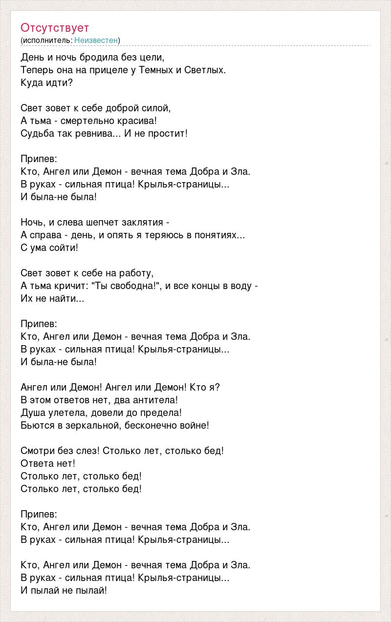 День и ночь бродила без цели, Теперь она на прицеле у Темных и Светлых. Куда идти? Свет зовет к себе доброй силой, А тьма - смертельно красива! Судьба так ревнива... И не простит! Припев: Кто, Ангел или Демон - вечная тема Добра и Зла. В руках - сильная птица! Крылья-страницы... И была-не была! Ночь, и слева шепчет заклятия - А справа - день, и опять я теряюсь в понятиях... С ума сойти! Свет зовет к себе на работу, А тьма кричит: "Ты свободна!", и все концы в воду - Их не найти... Припев: Кто, Ангел или Демон - вечная тема Добра и Зла. В руках - сильная птица! Крылья-страницы... И была-не была! Ангел или Демон! Ангел или Демон! Кто я? В этом ответов нет, два антитела! Душа улетела, довели до предела! Бьются в зеркальной, бесконечно войне! Смотри без слез! Столько лет, столько бед! Ответа нет! Столько лет, столько бед! Столько лет, столько бед! Припев: Кто, Ангел или Демон - вечная тема Добра и Зла. В руках - сильная птица! Крылья-страницы... Кто, Ангел или Демон - вечная тема Добра и Зла. В руках - сильная птица! Крылья-страницы... И пылай не пылай!
