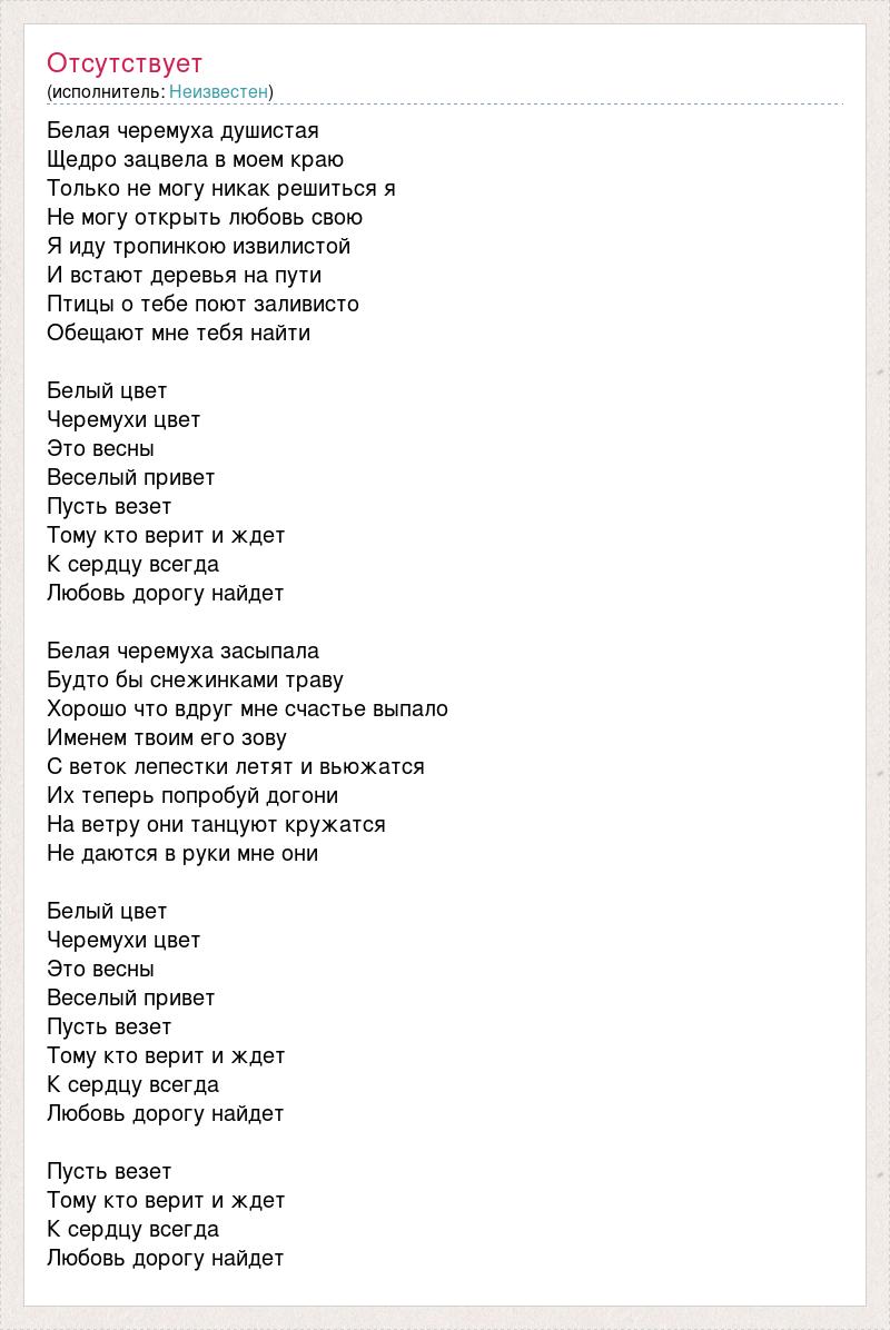 Белая черемуха душистая Щедро зацвела в моем краю Только не могу никак решиться я Не могу открыть любовь свою Я иду тропинкою извилистой И встают деревья на пути Птицы о тебе поют заливисто Обещают мне тебя найти Белый цвет Черемухи цвет Это весны Веселый привет Пусть везет Тому кто верит и ждет К сердцу всегда Любовь дорогу найдет Белая черемуха засыпала Будто бы снежинками траву Хорошо что вдруг мне счастье выпало Именем твоим его зову С веток лепестки летят и вьюжатся Их теперь попробуй догони На ветру они танцуют кружатся Не даются в руки мне они Белый цвет Черемухи цвет Это весны Веселый привет Пусть везет Тому кто верит и ждет К сердцу всегда Любовь дорогу найдет Пусть везет Тому кто верит и ждет К сердцу всегда Любовь дорогу найдет