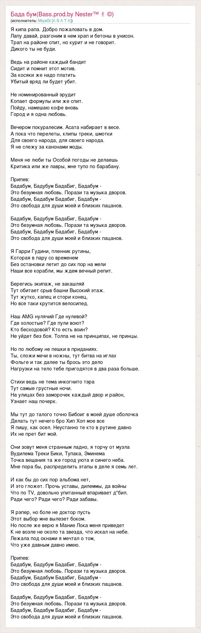 Я кипа рапа. Добро пожаловать в дом. Лапу давай, разгоним в нем храп и бетоны в унисон. Трап на районе спит, но курит и не говорит. Дикого ты не буди. Ведь на районе каждый бандит Сидит и помнит этот мотив. За косяки же надо платить Убитый вряд ли будет убит. Не номинированный эрудит Копает формулы или же спит. Пойду, намешаю кофе вновь Город и я одна любовь. Вечером покуралесим. Асата набирает в весе. А пока что перелеты, клипы треки, шмотки Для своего народа, для своего народа. Я не слежу за канонами моды. Меня не люби ты Особой погоды не делаешь Критика или же лавры, мне тупо по барабану. Припев: Бадабум, Бадубум БадаБиг, Бадабум - Это безумная любовь. Порази та музыка дворов. Бадабум, Бадабум Бадабиг, Бадабум - Это свобода для души моей и близких пацанов. Бадабум, Бадубум БадаБиг, Бадабум - Это безумная любовь. Порази та музыка дворов. Бадабум, Бадабум Бадабиг, Бадабум - Это свобода для души моей и близких пацанов. Я Гарри Гудини, пленник рутины, Которая в пару со временем Без остановки летит до сих пор на мели Наши все корабли, мы ждем вечный репит. Берегись экипаж, не закашляй Тут обитает срыв башни Высокий этаж. Тут жутко, капец и стори конец, Но все таки крутится велосипед. Наш AMG нулячий Где нулевой? Где холостые? Где пули воют? Кто бесходовой? Кто есть воин? Не уйдет без боя. Толпа не на принципах, не принцы. Но по любому не пешки в приданиях. Ты, сложи мечи в ножны, тут битва на иглах Фольге и так далее ты брось это дело Нагрузки на тело тебе пригодятся в два раза больше. Стихи ведь не тема инкогнито тэра Тут самые грустные ночи. На улицах без заморочек каждый двор и район, Узнает наш почерк. Мы тут до талого точно Бибоиг в моей душе оболочка Делать тут нечего бро Хип Хоп мое все Я пишу, как осел. Неустанно те кто в рутине давно Их не прет бит мой. Они зовут меня странным ладно, я торчу от музла Вудилема Треки Бики, Тупака, Эминема Точка вещания та же город уюта и синего неба. Мне пора бы, распределить этапы в деле я семь лет. И как бы до сих пор альбома нет, И это гложет. Прочь уставы, дилеммы, да войны Что по TV, довольно упитанный впаривает д*бил. Ради чего? Ради чего? Ради забавы. Я рэпер, но боле не доктор пусть Этот выбор мне вылезет боком. Но после же верю я Мание Лока меня приведет К не возле не около та звезда, что искал на небе. Лежала под окнами я мечтал о том, Что уже давным давно имею. Припев: Бадабум, Бадубум БадаБиг, Бадабум - Это безумная любовь. Порази та музыка дворов. Бадабум, Бадабум Бадабиг, Бадабум - Это свобода для души моей и близких пацанов. Бадабум, Бадубум БадаБиг, Бадабум - Это безумная любовь. Порази та музыка дворов. Бадабум, Бадабум Бадабиг, Бадабум - Это свобода для души моей и близких пацанов.