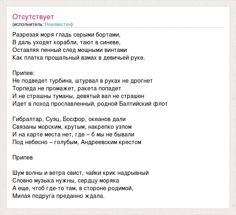 Разрезая моря гладь серыми бортами, В даль уходят корабли, тают в синеве, Оставляя пенный след мощными винтами Как платка прощальный взмах в девичьей руке. Припев: Не подведет турбина, штурвал в руках не дрогнет Торпеда не промажет, ракета попадет И не страшны туманы, девятый вал не страшен Идет в поход прославленный, родной Балтийский флот Гибралтар, Суэц, Босфор, океанов дали Связаны морским, крутым, накрепко узлом И на карте места нет, где – б мы не бывали Под небесно – голубым, Андреевским крестом Припев Шум волны и ветра свист, чайки крик надрывный Словно музыка нужны, сердцу моряка А еще, чтоб где-то там, в стороне родимой, Милая подруга преданно ждала.
