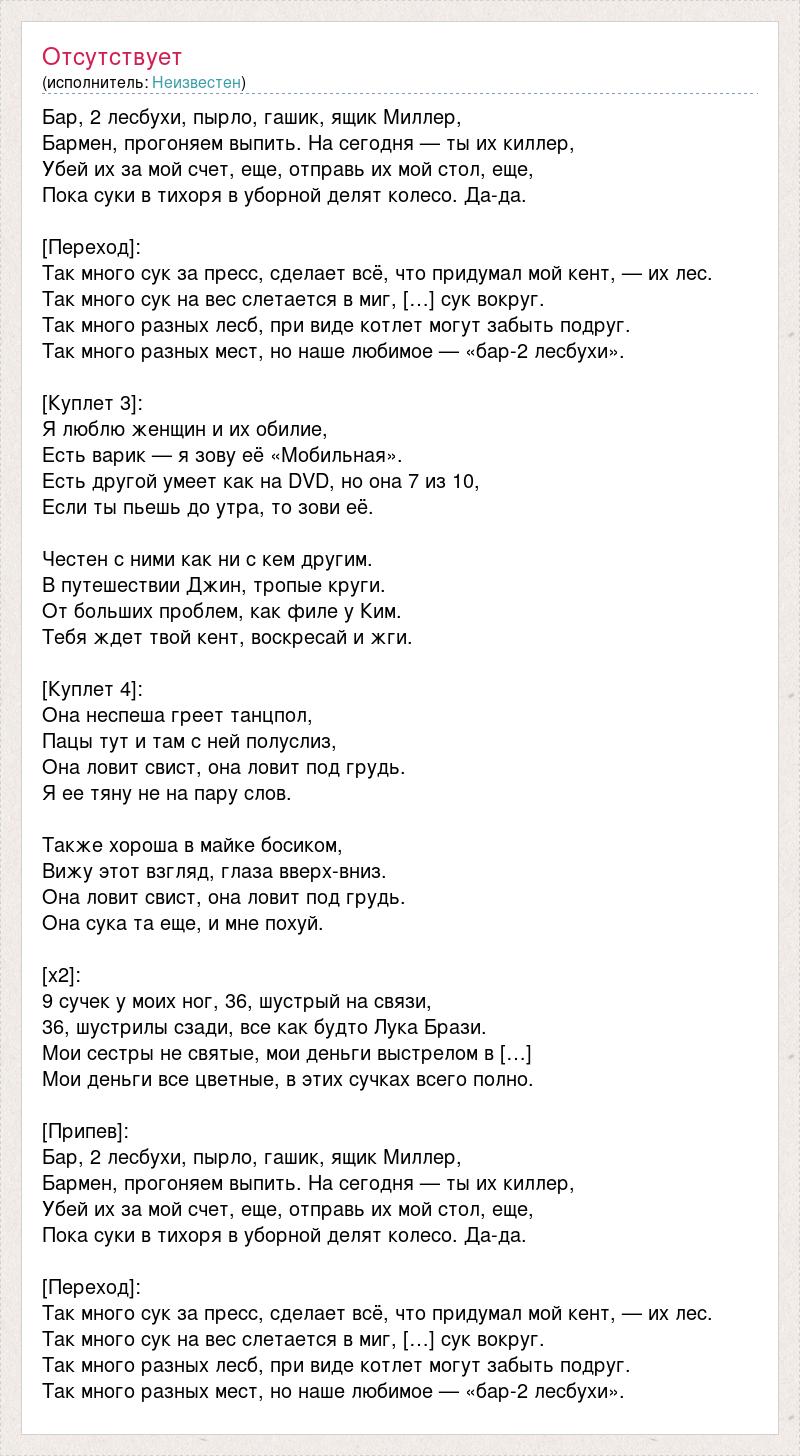 Бар, 2 лесбухи, пырло, гашик, ящик Миллер, Бармен, прогоняем выпить. На сегодня — ты их киллер, Убей их за мой счет, еще, отправь их мой стол, еще, Пока суки в тихоря в уборной делят колесо. Да-да. [Переход]: Так много сук за пресс, сделает всё, что придумал мой кент, — их лес. Так много сук на вес слетается в миг, […] сук вокруг. Так много разных лесб, при виде котлет могут забыть подруг. Так много разных мест, но наше любимое — «бар-2 лесбухи». [Куплет 3]: Я люблю женщин и их обилие, Есть варик — я зову её «Мобильная». Есть другой умеет как на DVD, но она 7 из 10, Если ты пьешь до утра, то зови её. Честен с ними как ни с кем другим. В путешествии Джин, тропые круги. От больших проблем, как филе у Ким. Тебя ждет твой кент, воскресай и жги. [Куплет 4]: Она неспеша греет танцпол, Пацы тут и там с ней полуслиз, Она ловит свист, она ловит под грудь. Я ее тяну не на пару слов. Также хороша в майке босиком, Вижу этот взгляд, глаза вверх-вниз. Она ловит свист, она ловит под грудь. Она сука та еще, и мне похуй. [х2]: 9 сучек у моих ног, 36, шустрый на связи, 36, шустрилы сзади, все как будто Лука Брази. Мои сестры не святые, мои деньги выстрелом в […] Мои деньги все цветные, в этих сучках всего полно. [Припев]: Бар, 2 лесбухи, пырло, гашик, ящик Миллер, Бармен, прогоняем выпить. На сегодня — ты их киллер, Убей их за мой счет, еще, отправь их мой стол, еще, Пока суки в тихоря в уборной делят колесо. Да-да. [Переход]: Так много сук за пресс, сделает всё, что придумал мой кент, — их лес. Так много сук на вес слетается в миг, […] сук вокруг. Так много разных лесб, при виде котлет могут забыть подруг. Так много разных мест, но наше любимое — «бар-2 лесбухи».