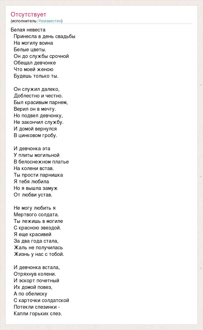 Белая невеста Принесла в день свадьбы На могилу воина Белые цветы. Он до службы срочной Обещал девчонке Что моей женою Будешь только ты. Он служил далеко, Доблестно и честно. Был красивым парнем, Верил он в мечту. Но подвел девчонку, Не закончил службу. И домой вернулся В цинковом гробу. И девчонка эта У плиты могильной В белоснежном платье На колени встав. Ты прости парнишка Я тебя любила Но я вышла замуж От любви устав. Не могу любить я Мертвого солдата. Ты лежишь в могиле С красною звездой. Я еще красивей За два года стала, Жаль не получилась Жизнь у нас с тобой. И девчонка встала, Отряхнув колени. И эскорт почетный Их домой повез, А по обелиску С карточки солдатской Потекли слезинки - Капли горьких слез.