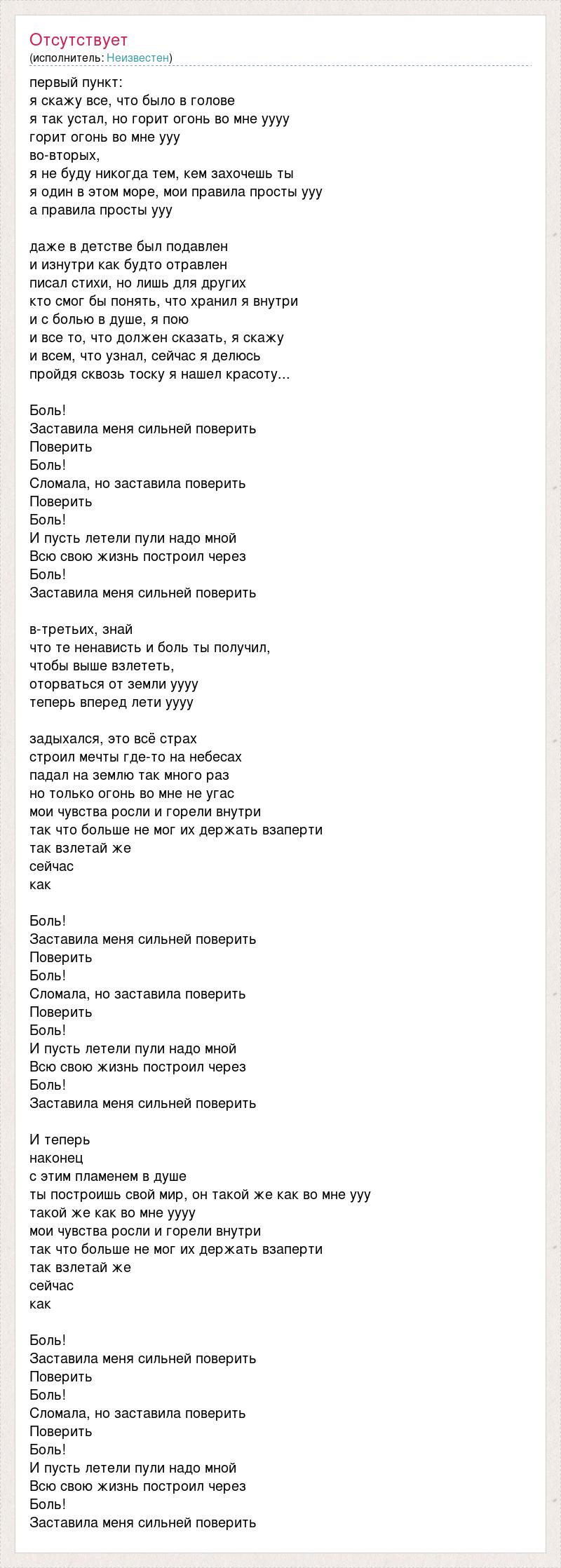 первый пункт: я скажу все, что было в голове я так устал, но горит огонь во мне уууу горит огонь во мне ууу во-вторых, я не буду никогда тем, кем захочешь ты я один в этом море, мои правила просты ууу а правила просты ууу даже в детстве был подавлен и изнутри как будто отравлен писал стихи, но лишь для других кто смог бы понять, что хранил я внутри и с болью в душе, я пою и все то, что должен сказать, я скажу и всем, что узнал, сейчас я делюсь пройдя сквозь тоску я нашел красоту... Боль! Заставила меня сильней поверить Поверить Боль! Сломала, но заставила поверить Поверить Боль! И пусть летели пули надо мной Всю свою жизнь построил через Боль! Заставила меня сильней поверить в-третьих, знай что те ненависть и боль ты получил, чтобы выше взлететь, оторваться от земли уууу теперь вперед лети уууу задыхался, это всё страх строил мечты где-то на небесах падал на землю так много раз но только огонь во мне не угас мои чувства росли и горели внутри так что больше не мог их держать взаперти так взлетай же сейчас как Боль! Заставила меня сильней поверить Поверить Боль! Сломала, но заставила поверить Поверить Боль! И пусть летели пули надо мной Всю свою жизнь построил через Боль! Заставила меня сильней поверить И теперь наконец с этим пламенем в душе ты построишь свой мир, он такой же как во мне ууу такой же как во мне уууу мои чувства росли и горели внутри так что больше не мог их держать взаперти так взлетай же сейчас как Боль! Заставила меня сильней поверить Поверить Боль! Сломала, но заставила поверить Поверить Боль! И пусть летели пули надо мной Всю свою жизнь построил через Боль! Заставила меня сильней поверить