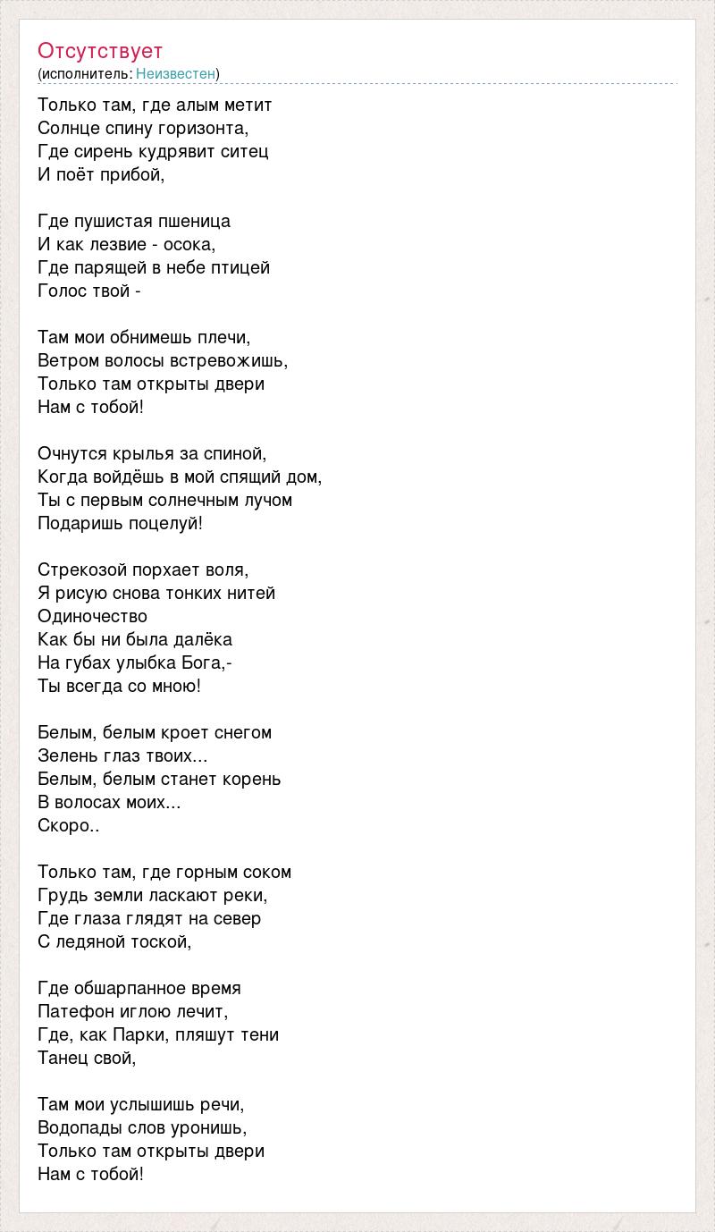 Только там, где алым метит Солнце спину горизонта, Где сирень кудрявит ситец И поёт прибой, Где пушистая пшеница И как лезвие - осока, Где парящей в небе птицей Голос твой - Там мои обнимешь плечи, Ветром волосы встревожишь, Только там открыты двери Нам с тобой! Очнутся крылья за спиной, Когда войдёшь в мой спящий дом, Ты с первым солнечным лучом Подаришь поцелуй! Стрекозой порхает воля, Я рисую снова тонких нитей Одиночество Как бы ни была далёка На губах улыбка Бога,- Ты всегда со мною! Белым, белым кроет снегом Зелень глаз твоих... Белым, белым станет корень В волосах моих... Скоро.. Только там, где горным соком Грудь земли ласкают реки, Где глаза глядят на север С ледяной тоской, Где обшарпанное время Патефон иглою лечит, Где, как Парки, пляшут тени Танец свой, Там мои услышишь речи, Водопады слов уронишь, Только там открыты двери Нам с тобой!