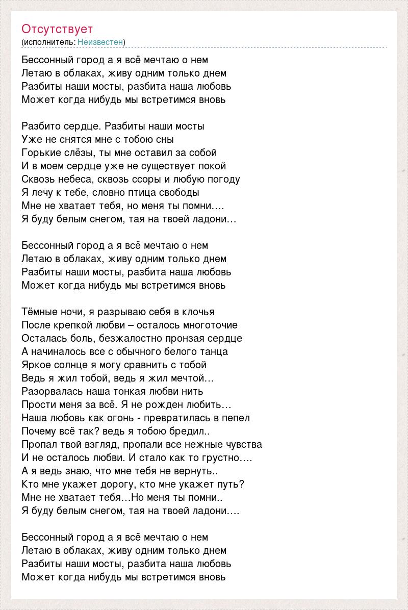 Бессонный город а я всё мечтаю о нем Летаю в облаках, живу одним только днем Разбиты наши мосты, разбита наша любовь Может когда нибудь мы встретимся вновь Разбито сердце. Разбиты наши мосты Уже не снятся мне с тобою сны Горькие слёзы, ты мне оставил за собой И в моем сердце уже не существует покой Сквозь небеса, сквозь ссоры и любую погоду Я лечу к тебе, словно птица свободы Мне не хватает тебя, но меня ты помни…. Я буду белым снегом, тая на твоей ладони… Бессонный город а я всё мечтаю о нем Летаю в облаках, живу одним только днем Разбиты наши мосты, разбита наша любовь Может когда нибудь мы встретимся вновь Тёмные ночи, я разрываю себя в клочья После крепкой любви – осталось многоточие Осталась боль, безжалостно пронзая сердце А начиналось все с обычного белого танца Яркое солнце я могу сравнить с тобой Ведь я жил тобой, ведь я жил мечтой… Разорвалась наша тонкая любви нить Прости меня за всё. Я не рожден любить… Наша любовь как огонь - превратилась в пепел Почему всё так? ведь я тобою бредил.. Пропал твой взгляд, пропали все нежные чувства И не осталось любви. И стало как то грустно…. А я ведь знаю, что мне тебя не вернуть.. Кто мне укажет дорогу, кто мне укажет путь? Мне не хватает тебя…Но меня ты помни.. Я буду белым снегом, тая на твоей ладони…. Бессонный город а я всё мечтаю о нем Летаю в облаках, живу одним только днем Разбиты наши мосты, разбита наша любовь Может когда нибудь мы встретимся вновь