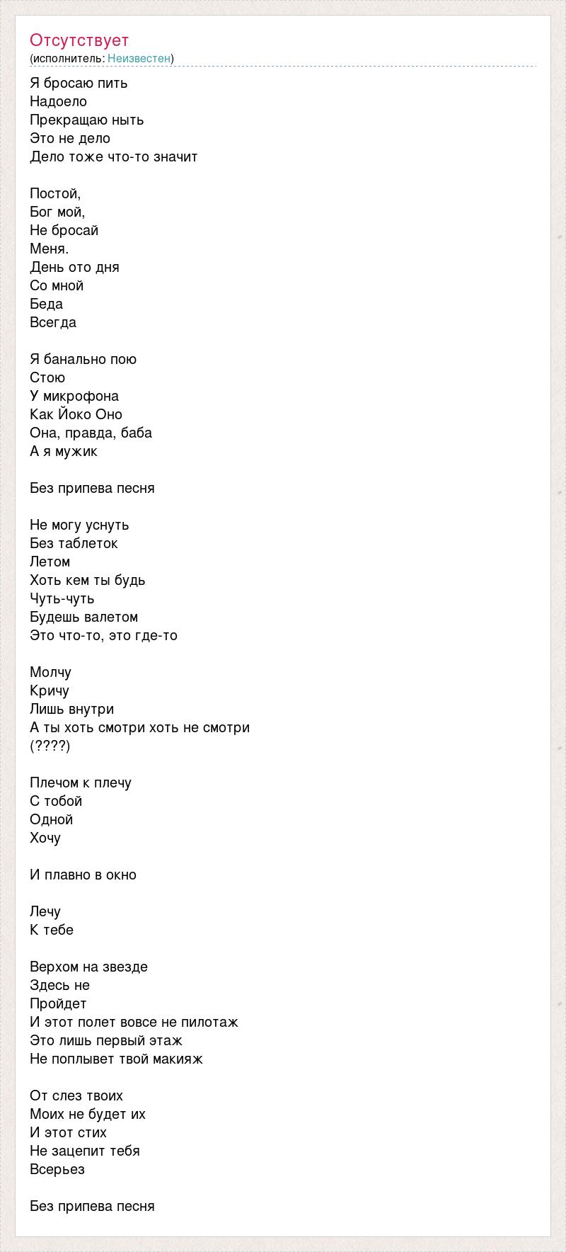 Я бросаю пить Надоело Прекращаю ныть Это не дело Дело тоже что-то значит Постой, Бог мой, Не бросай Меня. День ото дня Со мной Беда Всегда Я банально пою Стою У микрофона Как Йоко Оно Она, правда, баба А я мужик Без припева песня Не могу уснуть Без таблеток Летом Хоть кем ты будь Чуть-чуть Будешь валетом Это что-то, это где-то Молчу Кричу Лишь внутри А ты хоть смотри хоть не смотри (????) Плечом к плечу С тобой Одной Хочу И плавно в окно Лечу К тебе Верхом на звезде Здесь не Пройдет И этот полет вовсе не пилотаж Это лишь первый этаж Не поплывет твой макияж От слез твоих Моих не будет их И этот стих Не зацепит тебя Всерьез Без припева песня
