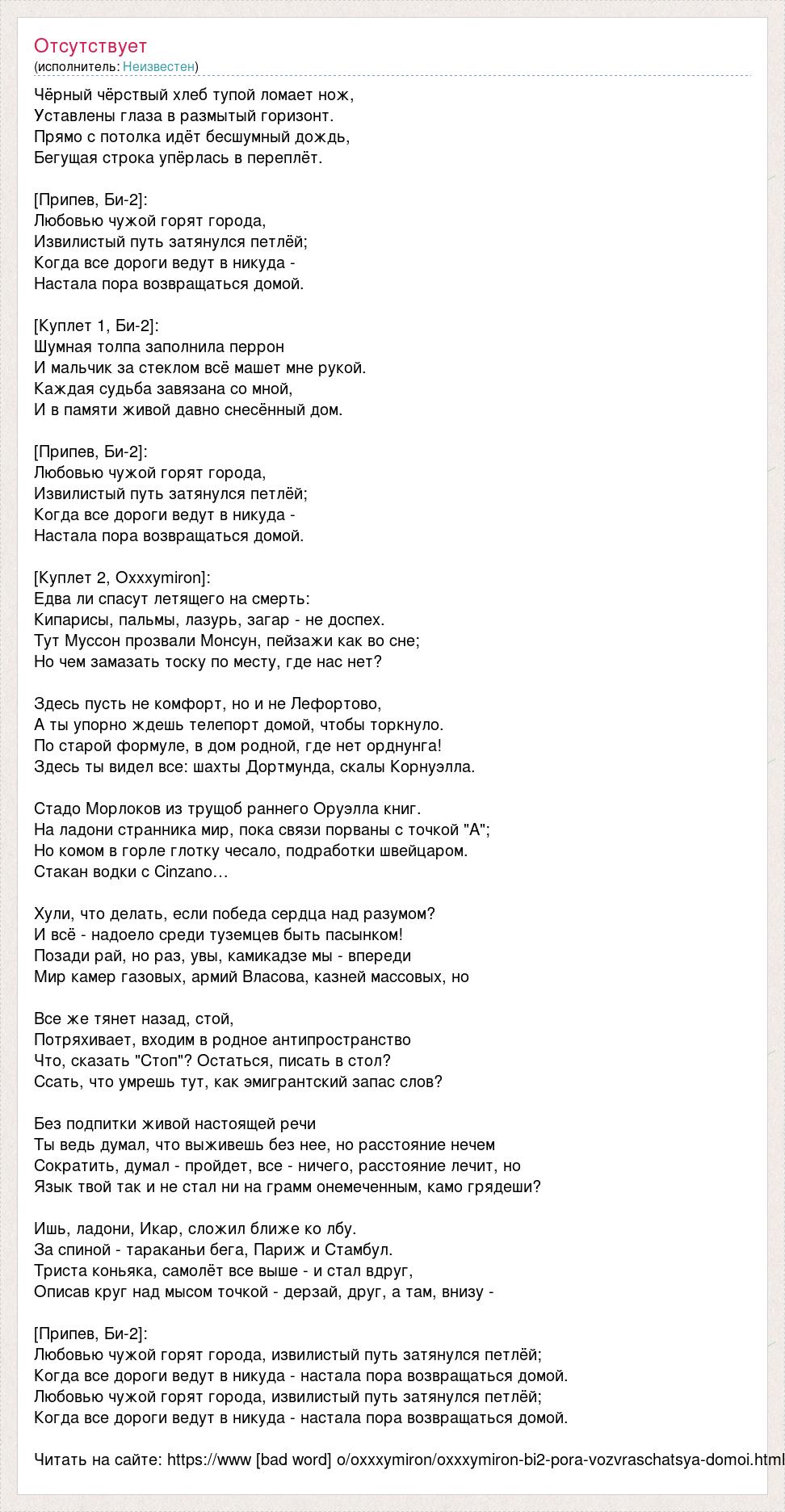 Чёрный чёрствый хлеб тупой ломает нож, Уставлены глаза в размытый горизонт. Прямо с потолка идёт бесшумный дождь, Бегущая строка упёрлась в переплёт. [Припев, Би-2]: Любовью чужой горят города, Извилистый путь затянулся петлёй; Когда все дороги ведут в никуда - Настала пора возвращаться домой. [Куплет 1, Би-2]: Шумная толпа заполнила перрон И мальчик за стеклом всё машет мне рукой. Каждая судьба завязана со мной, И в памяти живой давно снесённый дом. [Припев, Би-2]: Любовью чужой горят города, Извилистый путь затянулся петлёй; Когда все дороги ведут в никуда - Настала пора возвращаться домой. [Куплет 2, Oxxxymiron]: Едва ли спасут летящего на смерть: Кипарисы, пальмы, лазурь, загар - не доспех. Тут Муссон прозвали Монсун, пейзажи как во сне; Но чем замазать тоску по месту, где нас нет? Здесь пусть не комфорт, но и не Лефортово, А ты упорно ждешь телепорт домой, чтобы торкнуло. По старой формуле, в дом родной, где нет орднунга! Здесь ты видел все: шахты Дортмунда, скалы Корнуэлла. Стадо Морлоков из трущоб раннего Оруэлла книг. На ладони странника мир, пока связи порваны с точкой "А"; Но комом в горле глотку чесало, подработки швейцаром. Стакан водки с Cinzano… Хули, что делать, если победа сердца над разумом? И всё - надоело среди туземцев быть пасынком! Позади рай, но раз, увы, камикадзе мы - впереди Мир камер газовых, армий Власова, казней массовых, но Все же тянет назад, стой, Потряхивает, входим в родное антипространство Что, сказать "Стоп"? Остаться, писать в стол? Ссать, что умрешь тут, как эмигрантский запас слов? Без подпитки живой настоящей речи Ты ведь думал, что выживешь без нее, но расстояние нечем Сократить, думал - пройдет, все - ничего, расстояние лечит, но Язык твой так и не стал ни на грамм онемеченным, камо грядеши? Ишь, ладони, Икар, сложил ближе ко лбу. За спиной - тараканьи бега, Париж и Стамбул. Триста коньяка, самолёт все выше - и стал вдруг, Описав круг над мысом точкой - дерзай, друг, а там, внизу - [Припев, Би-2]: Любовью чужой горят города, извилистый путь затянулся петлёй; Когда все дороги ведут в никуда - настала пора возвращаться домой. Любовью чужой горят города, извилистый путь затянулся петлёй; Когда все дороги ведут в никуда - настала пора возвращаться домой. Читать на сайте: https://www [bad word] o/oxxxymiron/oxxxymiron-bi2-pora-vozvraschatsya-domoi.html