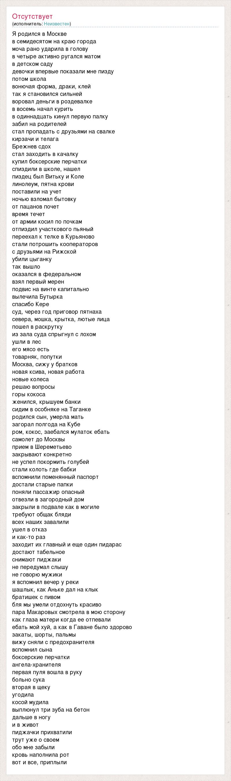 Я родился в Москве в семидесятом на краю города моча рано ударила в голову в четыре активно ругался матом в детском саду девочки впервые показали мне пизду потом школа вонючая форма, драки, клей так я становился сильней воровал деньги в роздевалке в восемь начал курить в одиннадцать кинул первую палку забил на родителей стал пропадать с друзьями на свалке кирзачи и телага Брежнев сдох стал заходить в качалку купил боксерские перчатки спиздили в школе, нашел пиздец был Витьку и Коле линолеум, пятна крови поставили на учет ночью взломал бытовку от пацанов почет время течет от армии косил по почкам отпиздил участкового пьяный переехал к телке в Курьяново стали потрошить кооператоров с друзьями на Рижской убили цыганку так вышло оказался в федеральном взял первый мерен подвис на винте капитально вылечила Бутырка спасибо Кере суд, через год приговор пятнаха севера, мошка, крытка, лютые лица пошел в раскрутку из зала суда спрыгнул с лохом ушли в лес его мясо есть товарняк, попутки Москва, сижу у братков новая ксива, новая работа новые колеса решаю вопросы горы кокоса женился, крышуем банки сидим в особняке на Таганке родился сын, умерла мать загорал полгода на Кубе ром, кокос, заебался мулаток ебать самолет до Москвы прием в Шереметьево закрывают конкретно не успел покормить голубей стали колоть где бабки вспомнили поменянный паспорт достали старые папки поняли пассажир опасный отвезли в загородный дом закрыли в подвале как в могиле требуют общак бляди всех наших завалили ушел в отказ и как-то раз заходит их главный и еще один пидарас достают табельное снимают пиджаки не передумал слышу не говорю мужики я вспомнил вечер у реки шашлык, как Аньке дал на клык братишек с пивом бля мы умели отдохнуть красиво пара Макаровых смотрела в мою сторону как глаза матери когда ее отпевали ебать мой хуй, а как в Гаване было здорово закаты, шорты, пальмы вижу сняли с предохранителя вспомнил сына боксерские перчатки ангела-хранителя первая пуля вошла в руку больно сука вторая в щеку угодила косой мудила выплюнул три зуба на бетон дальше в ногу и в живот пиджачки прихватили трут уже о своем обо мне забыли кровь наполнила рот вот и все, приплыли