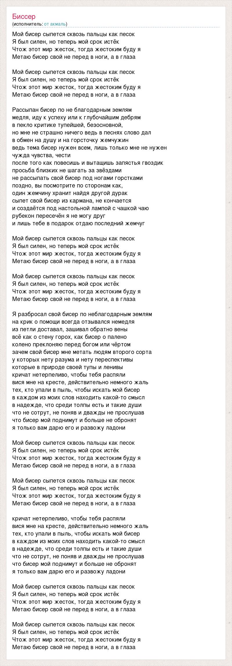 Мой бисер сыпется сквозь пальцы как песок Я был силен, но теперь мой срок истёк Чтож этот мир жесток, тогда жестоким буду я Метаю бисер свой не перед в ноги, а в глаза Мой бисер сыпется сквозь пальцы как песок Я был силен, но теперь мой срок истёк Чтож этот мир жесток, тогда жестоким буду я Метаю бисер свой не перед в ноги, а в глаза Рассыпан бисер по не благодарным землям медля, иду к успеху или к глубочайшим дебрям в пекло критике тупейшей, безосновной, но мне не страшно ничего ведь в песнях слово дал в обмен на душу и на горсточку жемчужин ведь тема бисер нужен всем, лишь только мне не нужен чужда чувства, чести после того как повесишь и вытащишь запястья гвоздик просьба близких не шагать за звёздами не рассыпать свой бисер под ногами горстками поздно, вы посмотрите по сторонам как, один жемчину хранит найдя другой дурак сыпет свой бисер из кармана, не кончается и создаётся под настольной лампой с чашкой чаю рубекон пересечён я не могу друг и лишь тебе в подарок отдаю последний жемчуг Мой бисер сыпется сквозь пальцы как песок Я был силен, но теперь мой срок истёк Чтож этот мир жесток, тогда жестоким буду я Метаю бисер свой не перед в ноги, а в глаза Мой бисер сыпется сквозь пальцы как песок Я был силен, но теперь мой срок истёк Чтож этот мир жесток, тогда жестоким буду я Метаю бисер свой не перед в ноги, а в глаза Я разбросал свой бисер по неблагодарным землям на крик о помощи всегда отзывался немедля из петли доставал, зашивал обратно вены всё как о стену горох, как бисер о палено колено преклоняю перед богом или чёртом зачем свой бисер мне метать людям второго сорта у которых нету разума и нету переспективы которые в природе своей тупы и ленивы кричат нетерпеливо, чтобы тебя распяли вися мне на кресте, действительно немного жаль тех, кто упали в пыль, чтобы искать мой бисер в каждом из моих слов находить какой-то смысл в надежде, что среди толпы есть и такие души что не сотрут, не поняв и дважды не прослушав что бисер мой поднимут и больше не обронят я только вам дарю его и развожу ладони Мой бисер сыпется сквозь пальцы как песок Я был силен, но теперь мой срок истёк Чтож этот мир жесток, тогда жестоким буду я Метаю бисер свой не перед в ноги, а в глаза Мой бисер сыпется сквозь пальцы как песок Я был силен, но теперь мой срок истёк Чтож этот мир жесток, тогда жестоким буду я Метаю бисер свой не перед в ноги, а в глаза кричат нетерпеливо, чтобы тебя распяли вися мне на кресте, действительно немного жаль тех, кто упали в пыль, чтобы искать мой бисер в каждом из моих слов находить какой-то смысл в надежде, что среди толпы есть и такие души что не сотрут, не поняв и дважды не прослушав что бисер мой поднимут и больше не обронят я только вам дарю его и развожу ладони Мой бисер сыпется сквозь пальцы как песок Я был силен, но теперь мой срок истёк Чтож этот мир жесток, тогда жестоким буду я Метаю бисер свой не перед в ноги, а в глаза Мой бисер сыпется сквозь пальцы как песок Я был силен, но теперь мой срок истёк Чтож этот мир жесток, тогда жестоким буду я Метаю бисер свой не перед в ноги, а в глаза