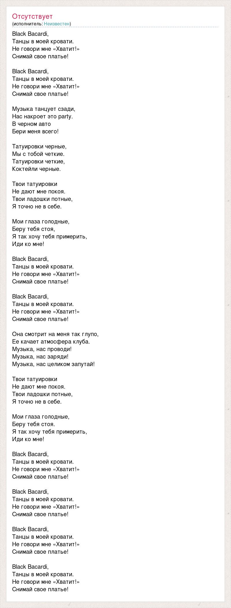 Black Bacardi, Танцы в моей кровати. Не говори мне «Хватит!» Снимай свое платье! Black Bacardi, Танцы в моей кровати. Не говори мне «Хватит!» Снимай свое платье! Музыка танцует сзади, Нас накроет это party. В черном авто Бери меня всего! Татуировки черные, Мы с тобой четкие. Татуировки четкие, Коктейли черные. Твои татуировки Не дают мне покоя. Твои ладошки потные, Я точно не в себе. Мои глаза голодные, Беру тебя стоя, Я так хочу тебя примерить, Иди ко мне! Black Bacardi, Танцы в моей кровати. Не говори мне «Хватит!» Снимай свое платье! Black Bacardi, Танцы в моей кровати. Не говори мне «Хватит!» Снимай свое платье! Она смотрит на меня так глупо, Ее качает атмосфера клуба. Музыка, нас проводи! Музыка, нас заряди! Музыка, нас целиком запутай! Твои татуировки Не дают мне покоя. Твои ладошки потные, Я точно не в себе. Мои глаза голодные, Беру тебя стоя. Я так хочу тебя примерить, Иди ко мне! Black Bacardi, Танцы в моей кровати. Не говори мне «Хватит!» Снимай свое платье! Black Bacardi, Танцы в моей кровати. Не говори мне «Хватит!» Снимай свое платье! Black Bacardi, Танцы в моей кровати. Не говори мне «Хватит!» Снимай свое платье! Black Bacardi, Танцы в моей кровати. Не говори мне «Хватит!» Снимай свое платье!