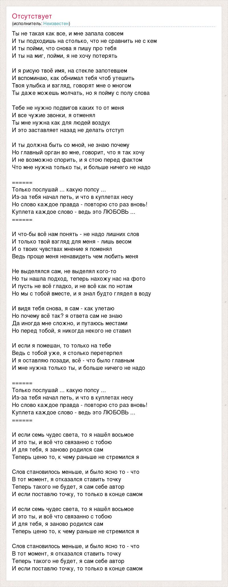 Ты не такая как все, и мне запала совсем И ты подходишь на столько, что не сравнить не с кем И ты пойми, что снова я пишу про тебя И ты на миг, пойми, я не хочу потерять И я рисую твоё имя, на стекле запотевшем И вспоминаю, как обнимал тебя чтоб утешить Твоя улыбка и взгляд, говорят мне о многом Ты даже можешь молчать, но я пойму с полу слова Тебе не нужно подвигов каких то от меня И все чужие звонки, я отменял Ты мне нужна как для людей воздух И это заставляет назад не делать отступ И ты должна быть со мной, не знаю почему Но главный орган во мне, говорит, что я так хочу И не возможно спорить, и я стою перед фактом Что мне нужна только ты, и больше ничего не надо ====== Только послушай ... какую попсу ... Из-за тебя начал петь, и что в куплетах несу Но слово каждое правда - повторю сто раз вновь! Куплета каждое слово - ведь это ЛЮБОВЬ ... ====== И что-бы всё нам понять - не надо лишних слов И только твой взгляд для меня - лишь весом И о твоих чувствах мнение я поменял Ведь проще меня ненавидеть чем любить меня Не выделялся сам, не выделял кого-то Но ты нашла подход, теперь нахожу нас на фото И пусть не всё гладко, и не всё как по нотам Но мы с тобой вместе, и я знал будто глядел в воду И видя тебя снова, я сам - как улетаю Но почему всё так? я ответа сам не знаю Да иногда мне сложно, и путаюсь местами Но перед тобой, я никогда некого не ставил И если я помешан, то только на тебе Ведь с тобой уже, я столько перетерпел И я оставляю позади, всё - что было главным И мне нужна только ты, и больше ничего не надо ====== Только послушай ... какую попсу ... Из-за тебя начал петь, и что в куплетах несу Но слово каждое правда - повторю сто раз вновь! Куплета каждое слово - ведь это ЛЮБОВЬ ... ====== И если семь чудес света, то я нашёл восьмое И это ты, и всё что связанно с тобою И для тебя, я заново родился сам Теперь ценю то, к чему раньше не стремился я Слов становилось меньше, и было ясно то - что В тот момент, я отказался ставить точку Теперь такого не будет, я сам себе автор И если поставлю точку, то только в конце самом И если семь чудес света, то я нашёл восьмое И это ты, и всё что связанно с тобою И для тебя, я заново родился сам Теперь ценю то, к чему раньше не стремился я Слов становилось меньше, и было ясно то - что В тот момент, я отказался ставить точку Теперь такого не будет, я сам себе автор И если поставлю точку, то только в конце самом