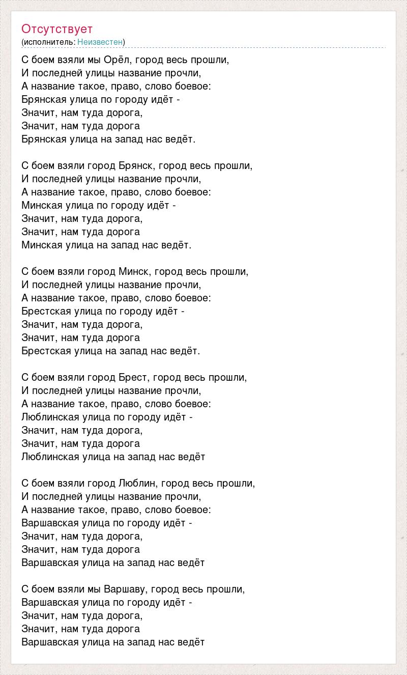 С боем взяли мы Орёл, город весь прошли, И последней улицы название прочли, А название такое, право, слово боевое: Брянская улица по городу идёт - Значит, нам туда дорога, Значит, нам туда дорога Брянская улица на запад нас ведёт. С боем взяли город Брянск, город весь прошли, И последней улицы название прочли, А название такое, право, слово боевое: Минская улица по городу идёт - Значит, нам туда дорога, Значит, нам туда дорога Минская улица на запад нас ведёт. С боем взяли город Минск, город весь прошли, И последней улицы название прочли, А название такое, право, слово боевое: Брестская улица по городу идёт - Значит, нам туда дорога, Значит, нам туда дорога Брестская улица на запад нас ведёт. С боем взяли город Брест, город весь прошли, И последней улицы название прочли, А название такое, право, слово боевое: Люблинская улица по городу идёт - Значит, нам туда дорога, Значит, нам туда дорога Люблинская улица на запад нас ведёт С боем взяли город Люблин, город весь прошли, И последней улицы название прочли, А название такое, право, слово боевое: Варшавская улица по городу идёт - Значит, нам туда дорога, Значит, нам туда дорога Варшавская улица на запад нас ведёт С боем взяли мы Варшаву, город весь прошли, Варшавская улица по городу идёт - Значит, нам туда дорога, Значит, нам туда дорога Варшавская улица на запад нас ведёт