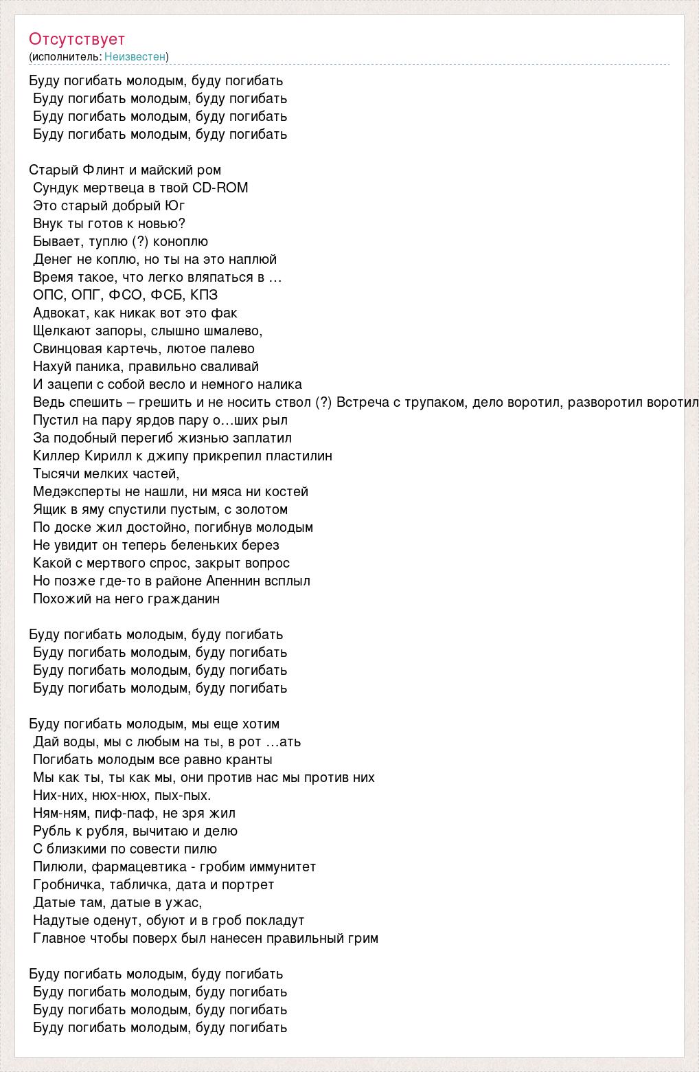 Буду погибать молодым, буду погибать Буду погибать молодым, буду погибать Буду погибать молодым, буду погибать Буду погибать молодым, буду погибать Старый Флинт и майский ром Сундук мертвеца в твой CD-ROM Это старый добрый Юг Внук ты готов к новью? Бывает, туплю (?) коноплю Денег не коплю, но ты на это наплюй Время такое, что легко вляпаться в … ОПС, ОПГ, ФСО, ФСБ, КПЗ Адвокат, как никак вот это фак Щелкают запоры, слышно шмалево, Свинцовая картечь, лютое палево Нахуй паника, правильно сваливай И зацепи с собой весло и немного налика Ведь спешить – грешить и не носить ствол (?) Встреча с трупаком, дело воротил, разворотил воротил Пустил на пару ярдов пару о…ших рыл За подобный перегиб жизнью заплатил Киллер Кирилл к джипу прикрепил пластилин Тысячи мелких частей, Медэксперты не нашли, ни мяса ни костей Ящик в яму спустили пустым, с золотом По доске жил достойно, погибнув молодым Не увидит он теперь беленьких берез Какой с мертвого спрос, закрыт вопрос Но позже где-то в районе Апеннин всплыл Похожий на него гражданин Буду погибать молодым, буду погибать Буду погибать молодым, буду погибать Буду погибать молодым, буду погибать Буду погибать молодым, буду погибать Буду погибать молодым, мы еще хотим Дай воды, мы с любым на ты, в рот …ать Погибать молодым все равно кранты Мы как ты, ты как мы, они против нас мы против них Них-них, нюх-нюх, пых-пых. Ням-ням, пиф-паф, не зря жил Рубль к рубля, вычитаю и делю С близкими по совести пилю Пилюли, фармацевтика - гробим иммунитет Гробничка, табличка, дата и портрет Датые там, датые в ужас, Надутые оденут, обуют и в гроб покладут Главное чтобы поверх был нанесен правильный грим Буду погибать молодым, буду погибать Буду погибать молодым, буду погибать Буду погибать молодым, буду погибать Буду погибать молодым, буду погибать