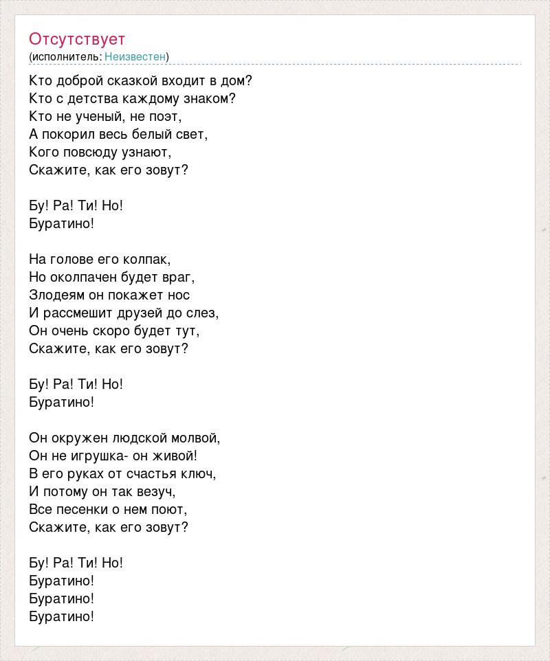 Кто доброй сказкой входит в дом? Кто с детства каждому знаком? Кто не ученый, не поэт, А покорил весь белый свет, Кого повсюду узнают, Скажите, как его зовут? Бу! Ра! Ти! Но! Буратино! На голове его колпак, Но околпачен будет враг, Злодеям он покажет нос И рассмешит друзей до слез, Он очень скоро будет тут, Скажите, как его зовут? Бу! Ра! Ти! Но! Буратино! Он окружен людской молвой, Он не игрушка- он живой! В его руках от счастья ключ, И потому он так везуч, Все песенки о нем поют, Скажите, как его зовут? Бу! Ра! Ти! Но! Буратино! Буратино! Буратино!