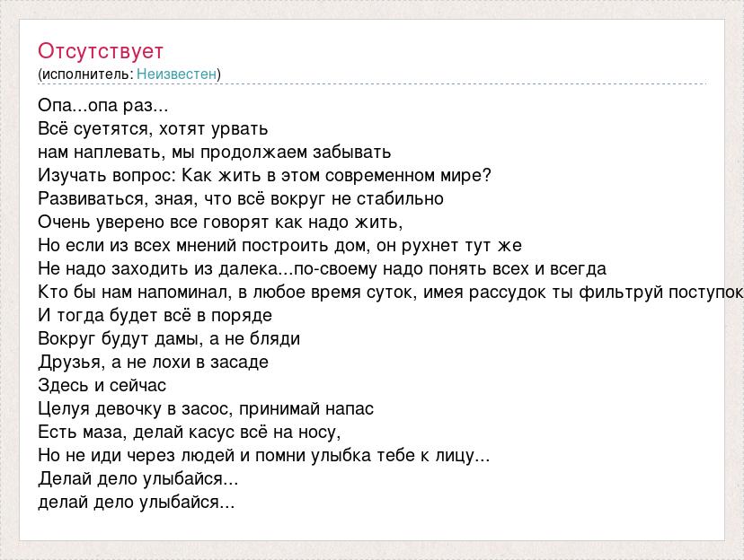Опа...опа раз... Всё суетятся, хотят урвать нам наплевать, мы продолжаем забывать Изучать вопрос: Как жить в этом современном мире? Развиваться, зная, что всё вокруг не стабильно Очень уверено все говорят как надо жить, Но если из всех мнений построить дом, он рухнет тут же Не надо заходить из далека...по-своему надо понять всех и всегда Кто бы нам напоминал, в любое время суток, имея рассудок ты фильтруй поступок И тогда будет всё в поряде Вокруг будут дамы, а не бляди Друзья, а не лохи в засаде Здесь и сейчас Целуя девочку в засос, принимай напас Есть маза, делай касус всё на носу, Но не иди через людей и помни улыбка тебе к лицу... Делай дело улыбайся... делай дело улыбайся...