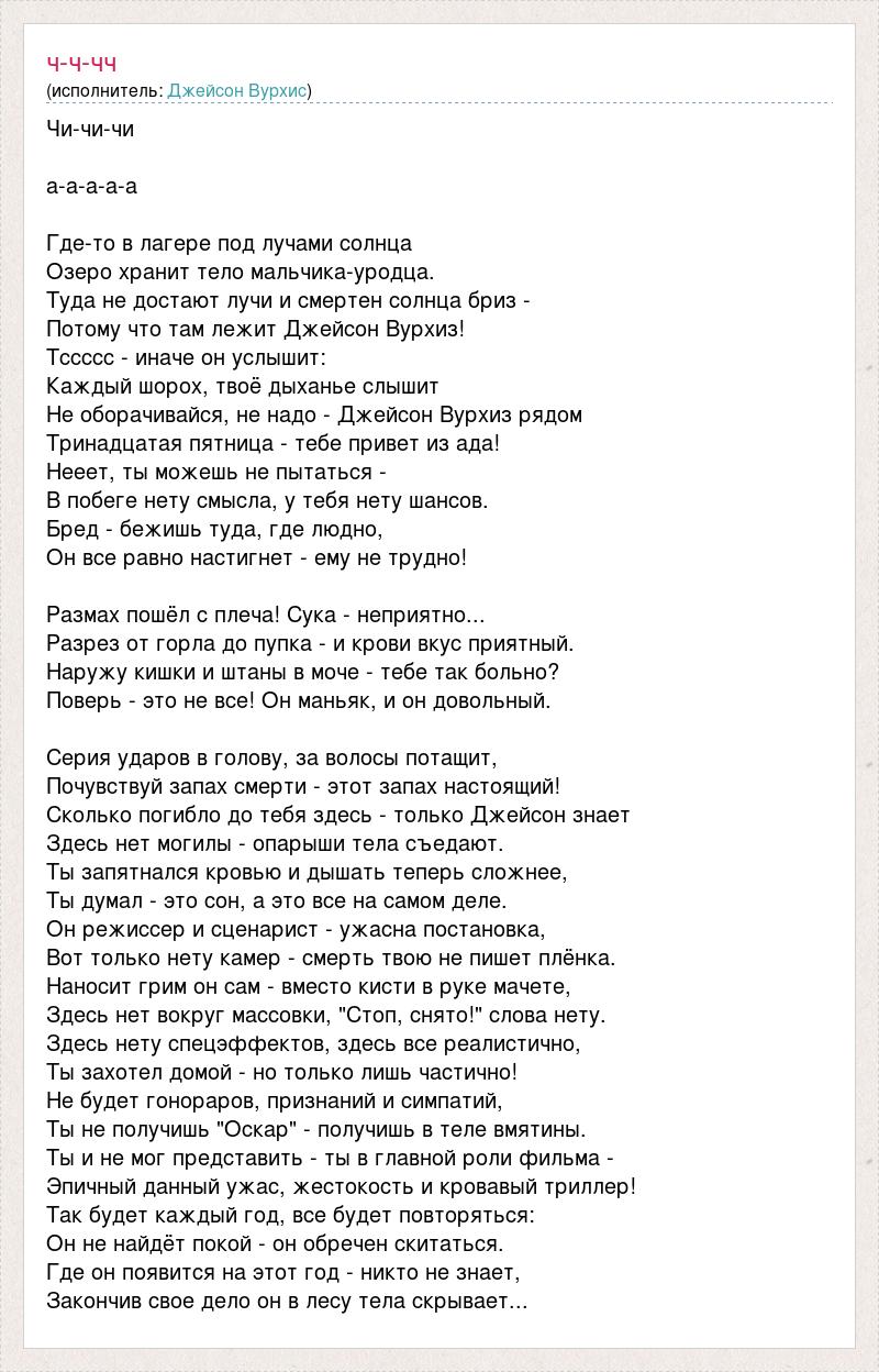 Чи-чи-чи а-а-а-а-а Где-то в лагере под лучами солнца Озеро хранит тело мальчика-уродца. Туда не достают лучи и смертен солнца бриз - Потому что там лежит Джейсон Вурхиз! Тссссс - иначе он услышит: Каждый шорох, твоё дыханье слышит Не оборачивайся, не надо - Джейсон Вурхиз рядом Тринадцатая пятница - тебе привет из ада! Нееет, ты можешь не пытаться - В побеге нету смысла, у тебя нету шансов. Бред - бежишь туда, где людно, Он все равно настигнет - ему не трудно! Размах пошёл с плеча! Сука - неприятно... Разрез от горла до пупка - и крови вкус приятный. Наружу кишки и штаны в моче - тебе так больно? Поверь - это не все! Он маньяк, и он довольный. Серия ударов в голову, за волосы потащит, Почувствуй запах смерти - этот запах настоящий! Сколько погибло до тебя здесь - только Джейсон знает Здесь нет могилы - опарыши тела съедают. Ты запятнался кровью и дышать теперь сложнее, Ты думал - это сон, а это все на самом деле. Он режиссер и сценарист - ужасна постановка, Вот только нету камер - смерть твою не пишет плёнка. Наносит грим он сам - вместо кисти в руке мачете, Здесь нет вокруг массовки, "Стоп, снято!" слова нету. Здесь нету спецэффектов, здесь все реалистично, Ты захотел домой - но только лишь частично! Не будет гонораров, признаний и симпатий, Ты не получишь "Оскар" - получишь в теле вмятины. Ты и не мог представить - ты в главной роли фильма - Эпичный данный ужас, жестокость и кровавый триллер! Так будет каждый год, все будет повторяться: Он не найдёт покой - он обречен скитаться. Где он появится на этот год - никто не знает, Закончив свое дело он в лесу тела скрывает...