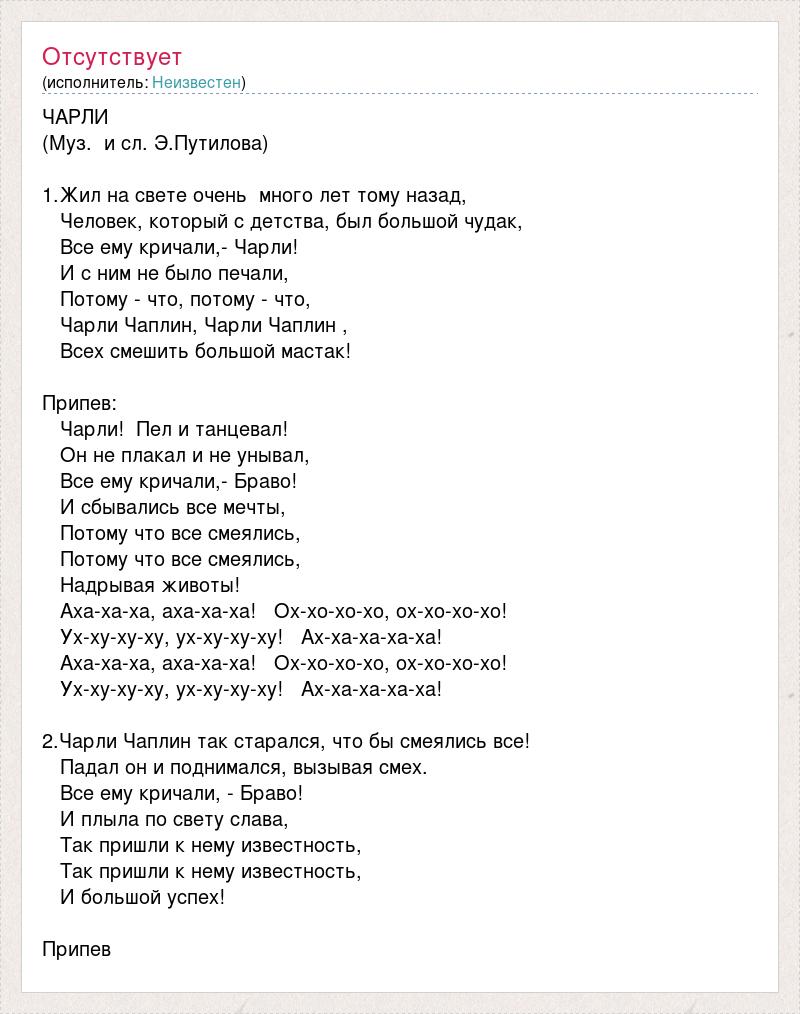 ЧАРЛИ (Муз. и сл. Э.Путилова) 1.Жил на свете очень много лет тому назад, Человек, который с детства, был большой чудак, Все ему кричали,- Чарли! И с ним не было печали, Потому - что, потому - что, Чарли Чаплин, Чарли Чаплин , Всех смешить большой мастак! Припев: Чарли! Пел и танцевал! Он не плакал и не унывал, Все ему кричали,- Браво! И сбывались все мечты, Потому что все смеялись, Потому что все смеялись, Надрывая животы! Аха-ха-ха, аха-ха-ха! Ох-хо-хо-хо, ох-хо-хо-хо! Ух-ху-ху-ху, ух-ху-ху-ху! Ах-ха-ха-ха-ха! Аха-ха-ха, аха-ха-ха! Ох-хо-хо-хо, ох-хо-хо-хо! Ух-ху-ху-ху, ух-ху-ху-ху! Ах-ха-ха-ха-ха! 2.Чарли Чаплин так старался, что бы смеялись все! Падал он и поднимался, вызывая смех. Все ему кричали, - Браво! И плыла по свету слава, Так пришли к нему известность, Так пришли к нему известность, И большой успех! Припев