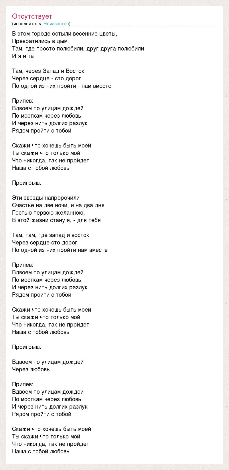 В этом городе остыли весенние цветы, Превратились в дым Там, где просто полюбили, друг друга полюбили И я и ты Там, через Запад и Восток Через сердце - сто дорог По одной из них пройти - нам вместе Припев: Вдвоем по улицам дождей По мосткам через любовь И через нить долгих разлук Рядом пройти с тобой Скажи что хочешь быть моей Ты скажи что только мой Что никогда, так не пройдет Наша с тобой любовь Проигрыш. Эти звезды напророчили Счастье на две ночи, и на два дня Гостью первою желанною, В этой жизни стану я, - для тебя Там, там, где запад и восток Через сердце сто дорог По одной из них пройти нам вместе Припев: Вдвоем по улицам дождей По мосткам через любовь И через нить долгих разлук Рядом пройти с тобой Скажи что хочешь быть моей Ты скажи что только мой Что никогда, так не пройдет Наша с тобой любовь Проигрыш. Вдвоем по улицам дождей Через любовь Припев: Вдвоем по улицам дождей По мосткам через любовь И через нить долгих разлук Рядом пройти с тобой Скажи что хочешь быть моей Ты скажи что только мой Что никогда, так не пройдет Наша с тобой любовь