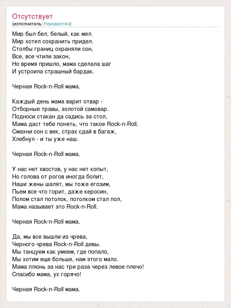 Мир был бел, белый, как мел. Мир хотел сохранить придел. Столбы границ охраняли сон, Все, все чтили закон, Но время пришло, мама сделала шаг И устроила страшный бардак. Черная Rock-n-Roll мама. Каждый день мама варит отвар - Отборные травы, золотой самовар. Подноси стакан да садись за стол, Мама даст тебе понять, что такое Rock-n-Roll. Смахни сон с век, страх сдай в багаж, Хлебнул - и ты уже наш. Черная Rock-n-Roll мама. У нас нет хвостов, у нас нет копыт, Но голова от рогов иногда болит, Наши жены шалят, мы тоже егозим, Пьем все что горит, даже керосин, Полом стал потолок, потолком стал пол, Мама называет это Rock-n-Roll. Черная Rock-n-Roll мама. Да, мы все вышли из чрева, Черного чрева Rock-n-Roll девы. Мы танцуем как умеем, где попало, Мы хотим еще больше, нам этого мало. Мама плюнь за нас три раза через левое плечо! Спасибо мама, ух горячо! Черная Rock-n-Roll мама.