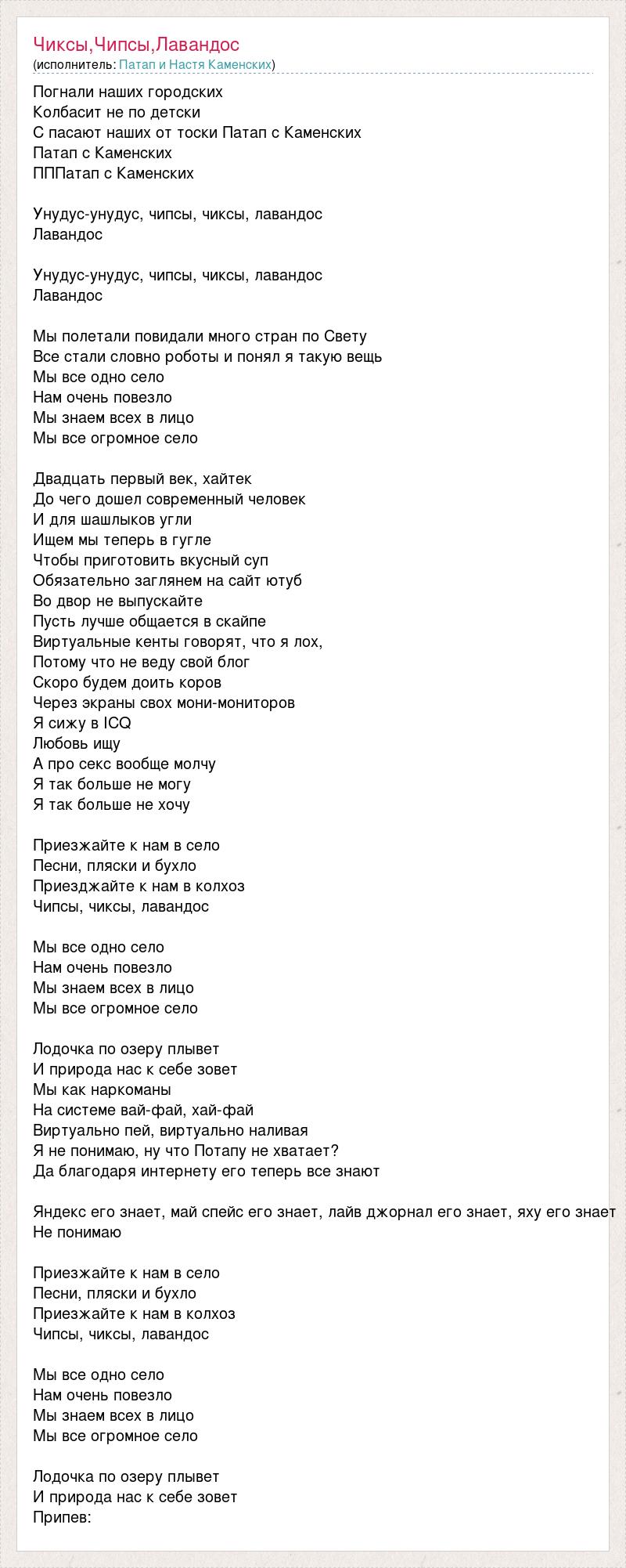 Погнали наших городских Колбасит не по детски С пасают наших от тоски Патап с Каменских Патап с Каменских ПППатап с Каменских Унудус-унудус, чипсы, чиксы, лавандос Лавандос Унудус-унудус, чипсы, чиксы, лавандос Лавандос Мы полетали повидали много стран по Свету Все стали словно роботы и понял я такую вещь Мы все одно село Нам очень повезло Мы знаем всех в лицо Мы все огромное село Двадцать первый век, хайтек До чего дошел современный человек И для шашлыков угли Ищем мы теперь в гугле Чтобы приготовить вкусный суп Обязательно заглянем на сайт ютуб Во двор не выпускайте Пусть лучше общается в скайпе Виртуальные кенты говорят, что я лох, Потому что не веду свой блог Скоро будем доить коров Через экраны свох мони-мониторов Я сижу в ICQ Любовь ищу А про секс вообще молчу Я так больше не могу Я так больше не хочу Приезжайте к нам в село Песни, пляски и бухло Приезджайте к нам в колхоз Чипсы, чиксы, лавандос Мы все одно село Нам очень повезло Мы знаем всех в лицо Мы все огромное село Лодочка по озеру плывет И природа нас к себе зовет Мы как наркоманы На системе вай-фай, хай-фай Виртуально пей, виртуально наливая Я не понимаю, ну что Потапу не хватает? Да благодаря интернету его теперь все знают Яндекс его знает, май спейс его знает, лайв джорнал его знает, яху его знает Не понимаю Приезжайте к нам в село Песни, пляски и бухло Приезжайте к нам в колхоз Чипсы, чиксы, лавандос Мы все одно село Нам очень повезло Мы знаем всех в лицо Мы все огромное село Лодочка по озеру плывет И природа нас к себе зовет Припев: