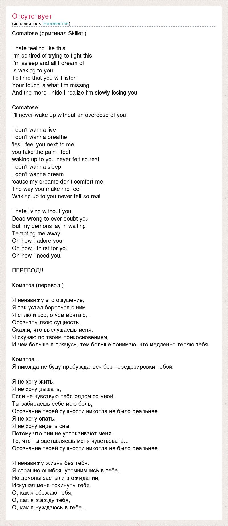 Comatose (оригинал Skillet ) I hate feeling like this I'm so tired of trying to fight this I'm asleep and all I dream of Is waking to you Tell me that you will listen Your touch is what I'm missing And the more I hide I realize I'm slowly losing you Comatose I'll never wake up without an overdose of you I don't wanna live I don't wanna breathe 'les I feel you next to me you take the pain I feel waking up to you never felt so real I don't wanna sleep I don't wanna dream 'cause my dreams don't comfort me The way you make me feel Waking up to you never felt so real I hate living without you Dead wrong to ever doubt you But my demons lay in waiting Tempting me away Oh how I adore you Oh how I thirst for you Oh how I need you. ПЕРЕВОД!! Коматоз (перевод ) Я ненавижу это ощущение, Я так устал бороться с ним. Я сплю и все, о чем мечтаю, - Осознать твою сущность. Скажи, что выслушаешь меня. Я скучаю по твоим прикосновениям, И чем больше я прячусь, тем больше понимаю, что медленно теряю тебя. Коматоз... Я никогда не буду пробуждаться без передозировки тобой. Я не хочу жить, Я не хочу дышать, Если не чувствую тебя рядом со мной. Ты забираешь себе мою боль, Осознание твоей сущности никогда не было реальнее. Я не хочу спать, Я не хочу видеть сны, Потому что они не успокаивают меня. То, что ты заставляешь меня чувствовать... Осознание твоей сущности никогда не было реальнее. Я ненавижу жизнь без тебя. Я страшно ошибся, усомнившись в тебе, Но демоны застыли в ожидании, Искушая меня покинуть тебя. О, как я обожаю тебя, О, как я жажду тебя, О, как я нуждаюсь в тебе...