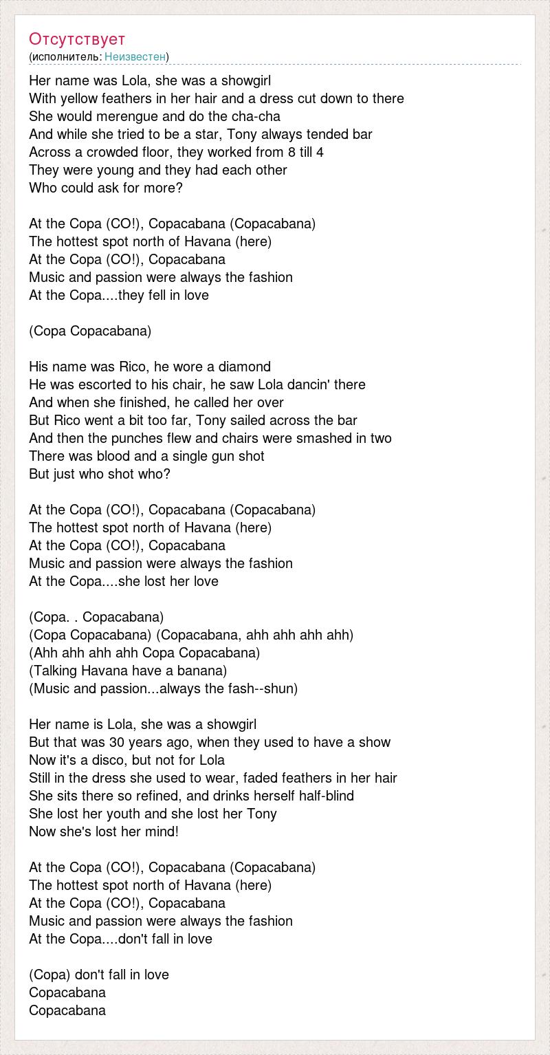 Her name was Lola, she was a showgirl With yellow feathers in her hair and a dress cut down to there She would merengue and do the cha-cha And while she tried to be a star, Tony always tended bar Across a crowded floor, they worked from 8 till 4 They were young and they had each other Who could ask for more? At the Copa (CO!), Copacabana (Copacabana) The hottest spot north of Havana (here) At the Copa (CO!), Copacabana Music and passion were always the fashion At the Copa....they fell in love (Copa Copacabana) His name was Rico, he wore a diamond He was escorted to his chair, he saw Lola dancin' there And when she finished, he called her over But Rico went a bit too far, Tony sailed across the bar And then the punches flew and chairs were smashed in two There was blood and a single gun shot But just who shot who? At the Copa (CO!), Copacabana (Copacabana) The hottest spot north of Havana (here) At the Copa (CO!), Copacabana Music and passion were always the fashion At the Copa....she lost her love (Copa. . Copacabana) (Copa Copacabana) (Copacabana, ahh ahh ahh ahh) (Ahh ahh ahh ahh Copa Copacabana) (Talking Havana have a banana) (Music and passion...always the fash--shun) Her name is Lola, she was a showgirl But that was 30 years ago, when they used to have a show Now it's a disco, but not for Lola Still in the dress she used to wear, faded feathers in her hair She sits there so refined, and drinks herself half-blind She lost her youth and she lost her Tony Now she's lost her mind! At the Copa (CO!), Copacabana (Copacabana) The hottest spot north of Havana (here) At the Copa (CO!), Copacabana Music and passion were always the fashion At the Copa....don't fall in love (Copa) don't fall in love Copacabana Copacabana