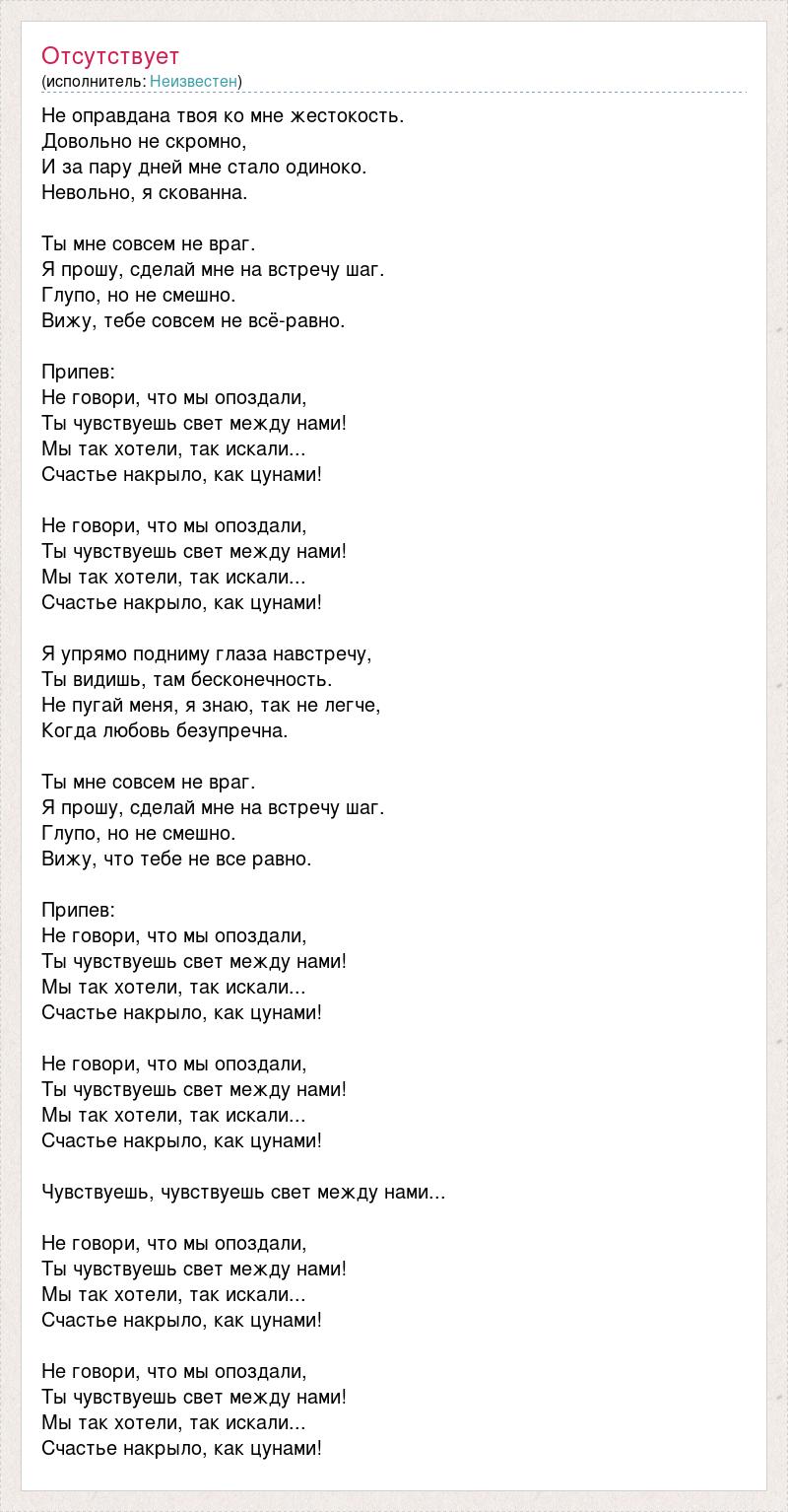 Не оправдана твоя ко мне жестокость. Довольно не скромно, И за пару дней мне стало одиноко. Невольно, я скованна. Ты мне совсем не враг. Я прошу, сделай мне на встречу шаг. Глупо, но не смешно. Вижу, тебе совсем не всё-равно. Припев: Не говори, что мы опоздали, Ты чувствуешь свет между нами! Мы так хотели, так искали... Счастье накрыло, как цунами! Не говори, что мы опоздали, Ты чувствуешь свет между нами! Мы так хотели, так искали... Счастье накрыло, как цунами! Я упрямо подниму глаза навстречу, Ты видишь, там бесконечность. Не пугай меня, я знаю, так не легче, Когда любовь безупречна. Ты мне совсем не враг. Я прошу, сделай мне на встречу шаг. Глупо, но не смешно. Вижу, что тебе не все равно. Припев: Не говори, что мы опоздали, Ты чувствуешь свет между нами! Мы так хотели, так искали... Счастье накрыло, как цунами! Не говори, что мы опоздали, Ты чувствуешь свет между нами! Мы так хотели, так искали... Счастье накрыло, как цунами! Чувствуешь, чувствуешь свет между нами... Не говори, что мы опоздали, Ты чувствуешь свет между нами! Мы так хотели, так искали... Счастье накрыло, как цунами! Не говори, что мы опоздали, Ты чувствуешь свет между нами! Мы так хотели, так искали... Счастье накрыло, как цунами!