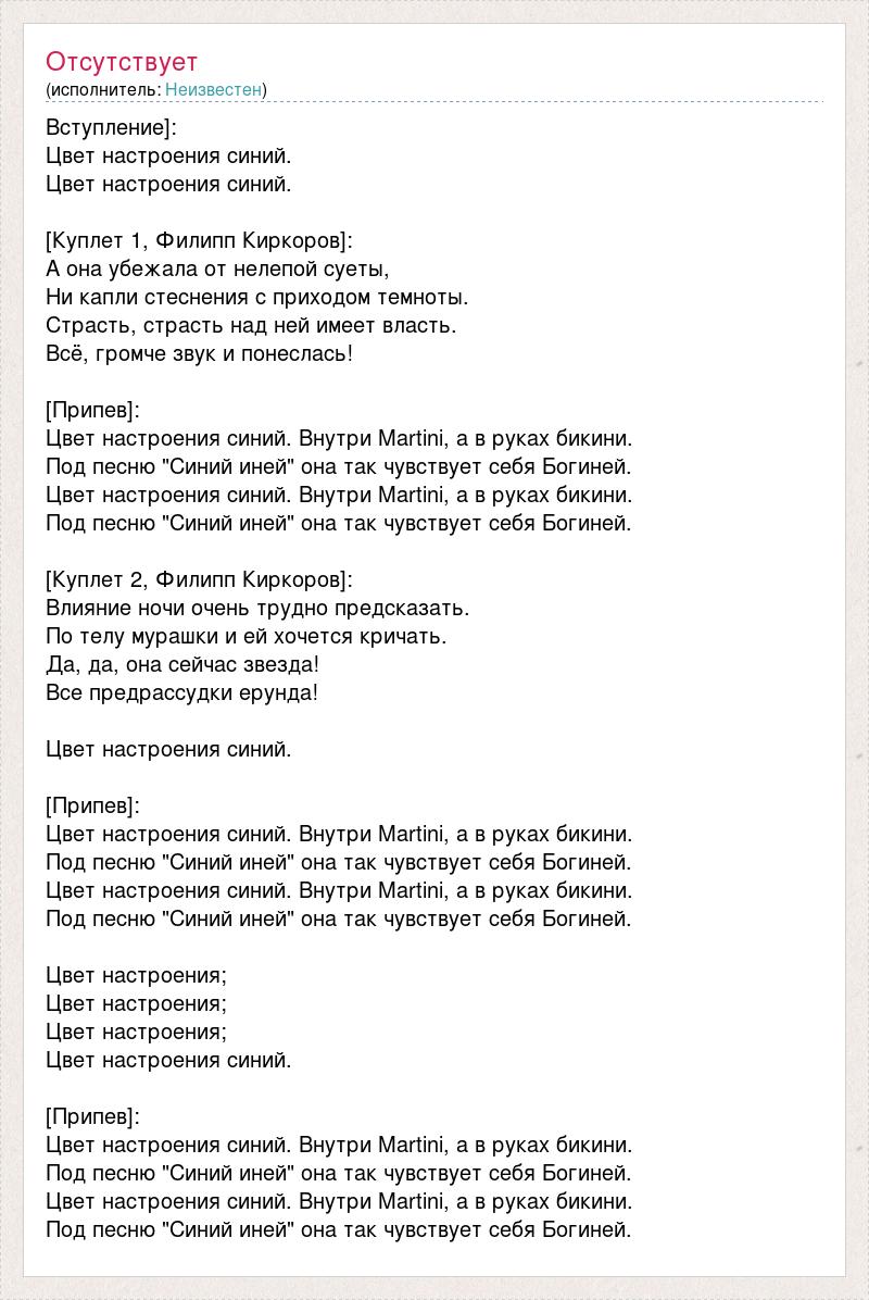 Вступление]: Цвет настроения синий. Цвет настроения синий. [Куплет 1, Филипп Киркоров]: А она убежала от нелепой суеты, Ни капли стеснения с приходом темноты. Страсть, страсть над ней имеет власть. Всё, громче звук и понеслась! [Припев]: Цвет настроения синий. Внутри Martini, а в руках бикини. Под песню "Синий иней" она так чувствует себя Богиней. Цвет настроения синий. Внутри Martini, а в руках бикини. Под песню "Синий иней" она так чувствует себя Богиней. [Куплет 2, Филипп Киркоров]: Влияние ночи очень трудно предсказать. По телу мурашки и ей хочется кричать. Да, да, она сейчас звезда! Все предрассудки ерунда! Цвет настроения синий. [Припев]: Цвет настроения синий. Внутри Martini, а в руках бикини. Под песню "Синий иней" она так чувствует себя Богиней. Цвет настроения синий. Внутри Martini, а в руках бикини. Под песню "Синий иней" она так чувствует себя Богиней. Цвет настроения; Цвет настроения; Цвет настроения; Цвет настроения синий. [Припев]: Цвет настроения синий. Внутри Martini, а в руках бикини. Под песню "Синий иней" она так чувствует себя Богиней. Цвет настроения синий. Внутри Martini, а в руках бикини. Под песню "Синий иней" она так чувствует себя Богиней.