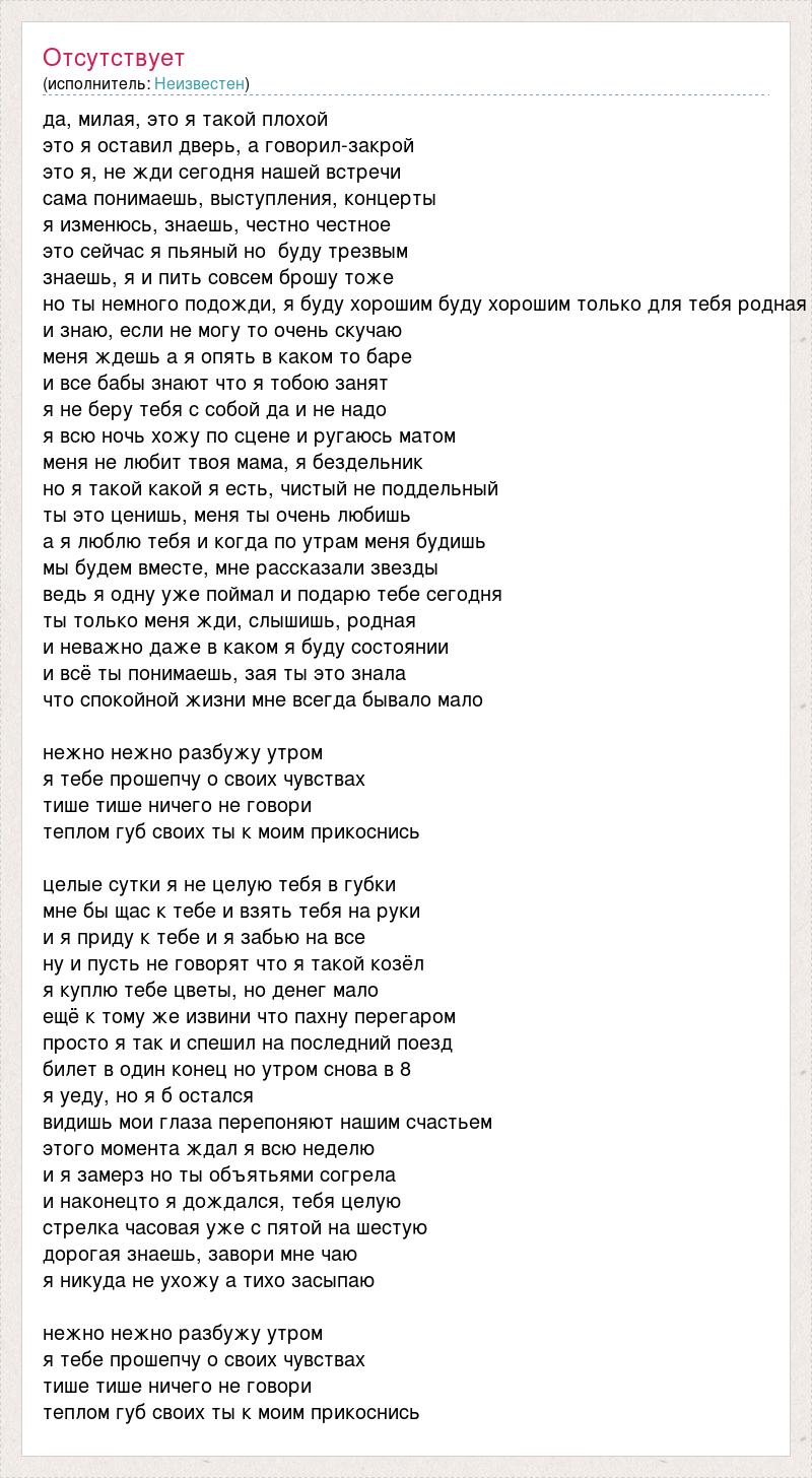 да, милая, это я такой плохой это я оставил дверь, а говорил-закрой это я, не жди сегодня нашей встречи сама понимаешь, выступления, концерты я изменюсь, знаешь, честно честное это сейчас я пьяный но буду трезвым знаешь, я и пить совсем брошу тоже но ты немного подожди, я буду хорошим буду хорошим только для тебя родная и знаю, если не могу то очень скучаю меня ждешь а я опять в каком то баре и все бабы знают что я тобою занят я не беру тебя с собой да и не надо я всю ночь хожу по сцене и ругаюсь матом меня не любит твоя мама, я бездельник но я такой какой я есть, чистый не поддельный ты это ценишь, меня ты очень любишь а я люблю тебя и когда по утрам меня будишь мы будем вместе, мне рассказали звезды ведь я одну уже поймал и подарю тебе сегодня ты только меня жди, слышишь, родная и неважно даже в каком я буду состоянии и всё ты понимаешь, зая ты это знала что спокойной жизни мне всегда бывало мало нежно нежно разбужу утром я тебе прошепчу о своих чувствах тише тише ничего не говори теплом губ своих ты к моим прикоснись целые сутки я не целую тебя в губки мне бы щас к тебе и взять тебя на руки и я приду к тебе и я забью на все ну и пусть не говорят что я такой козёл я куплю тебе цветы, но денег мало ещё к тому же извини что пахну перегаром просто я так и спешил на последний поезд билет в один конец но утром снова в 8 я уеду, но я б остался видишь мои глаза перепоняют нашим счастьем этого момента ждал я всю неделю и я замерз но ты объятьями согрела и наконецто я дождался, тебя целую стрелка часовая уже с пятой на шестую дорогая знаешь, завори мне чаю я никуда не ухожу а тихо засыпаю нежно нежно разбужу утром я тебе прошепчу о своих чувствах тише тише ничего не говори теплом губ своих ты к моим прикоснись