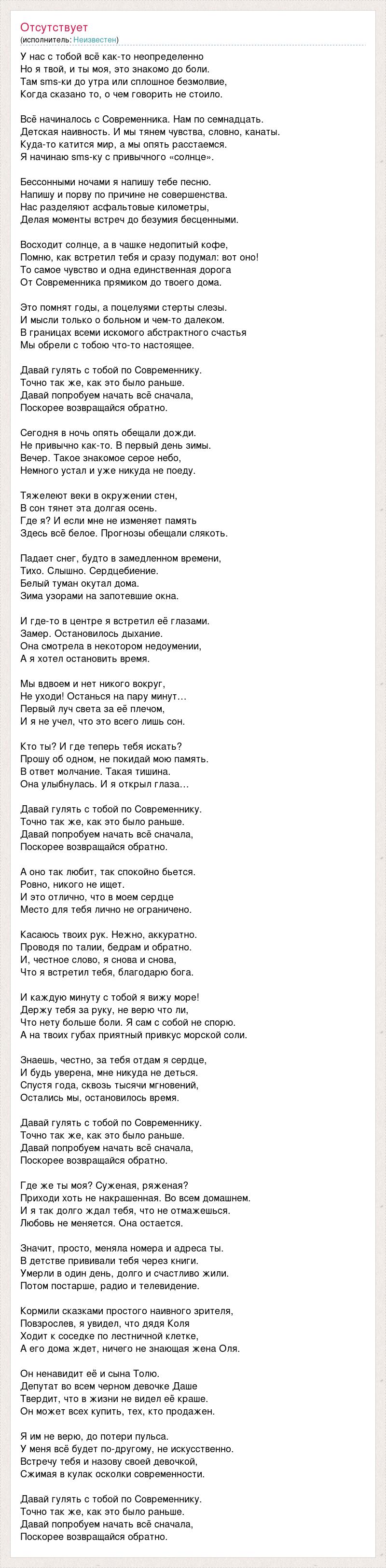 У нас с тобой всё как-то неопределенно Но я твой, и ты моя, это знакомо до боли. Там sms-ки до утра или сплошное безмолвие, Когда сказано то, о чем говорить не стоило. Всё начиналось с Современника. Нам по семнадцать. Детская наивность. И мы тянем чувства, словно, канаты. Куда-то катится мир, а мы опять расстаемся. Я начинаю sms-ку с привычного «солнце». Бессонными ночами я напишу тебе песню. Напишу и порву по причине не совершенства. Нас разделяют асфальтовые километры, Делая моменты встреч до безумия бесценными. Восходит солнце, а в чашке недопитый кофе, Помню, как встретил тебя и сразу подумал: вот оно! То самое чувство и одна единственная дорога От Современника прямиком до твоего дома. Это помнят годы, а поцелуями стерты слезы. И мысли только о больном и чем-то далеком. В границах всеми искомого абстрактного счастья Мы обрели с тобою что-то настоящее. Давай гулять с тобой по Современнику. Точно так же, как это было раньше. Давай попробуем начать всё сначала, Поскорее возвращайся обратно. Сегодня в ночь опять обещали дожди. Не привычно как-то. В первый день зимы. Вечер. Такое знакомое серое небо, Немного устал и уже никуда не поеду. Тяжелеют веки в окружении стен, В сон тянет эта долгая осень. Где я? И если мне не изменяет память Здесь всё белое. Прогнозы обещали слякоть. Падает снег, будто в замедленном времени, Тихо. Слышно. Сердцебиение. Белый туман окутал дома. Зима узорами на запотевшие окна. И где-то в центре я встретил её глазами. Замер. Остановилось дыхание. Она смотрела в некотором недоумении, А я хотел остановить время. Мы вдвоем и нет никого вокруг, Не уходи! Останься на пару минут… Первый луч света за её плечом, И я не учел, что это всего лишь сон. Кто ты? И где теперь тебя искать? Прошу об одном, не покидай мою память. В ответ молчание. Такая тишина. Она улыбнулась. И я открыл глаза… Давай гулять с тобой по Современнику. Точно так же, как это было раньше. Давай попробуем начать всё сначала, Поскорее возвращайся обратно. А оно так любит, так спокойно бьется. Ровно, никого не ищет. И это отлично, что в моем сердце Место для тебя лично не ограничено. Касаюсь твоих рук. Нежно, аккуратно. Проводя по талии, бедрам и обратно. И, честное слово, я снова и снова, Что я встретил тебя, благодарю бога. И каждую минуту с тобой я вижу море! Держу тебя за руку, не верю что ли, Что нету больше боли. Я сам с собой не спорю. А на твоих губах приятный привкус морской соли. Знаешь, честно, за тебя отдам я сердце, И будь уверена, мне никуда не деться. Спустя года, сквозь тысячи мгновений, Остались мы, остановилось время. Давай гулять с тобой по Современнику. Точно так же, как это было раньше. Давай попробуем начать всё сначала, Поскорее возвращайся обратно. Где же ты моя? Суженая, ряженая? Приходи хоть не накрашенная. Во всем домашнем. И я так долго ждал тебя, что не отмажешься. Любовь не меняется. Она остается. Значит, просто, меняла номера и адреса ты. В детстве прививали тебя через книги. Умерли в один день, долго и счастливо жили. Потом постарше, радио и телевидение. Кормили сказками простого наивного зрителя, Повзрослев, я увидел, что дядя Коля Ходит к соседке по лестничной клетке, А его дома ждет, ничего не знающая жена Оля. Он ненавидит её и сына Толю. Депутат во всем черном девочке Даше Твердит, что в жизни не видел её краше. Он может всех купить, тех, кто продажен. Я им не верю, до потери пул