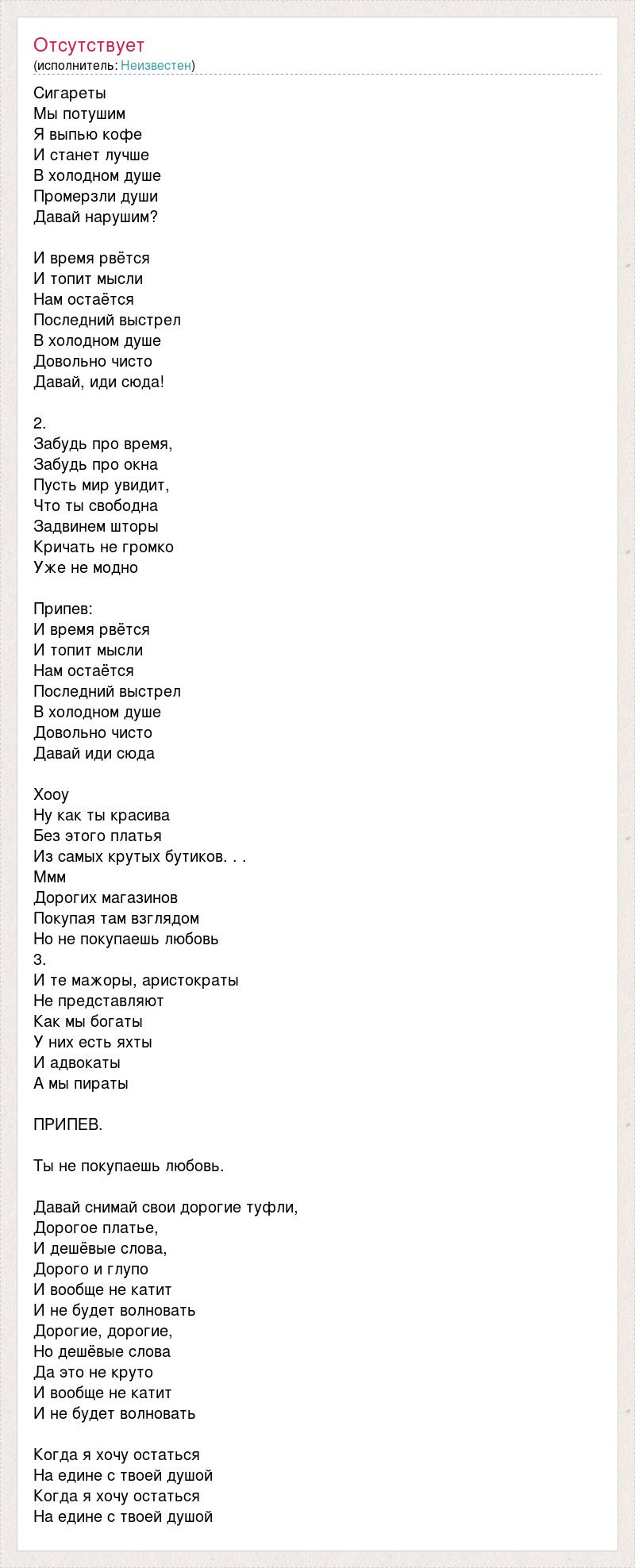 Сигареты Мы потушим Я выпью кофе И станет лучше В холодном душе Промерзли души Давай нарушим? И время рвётся И топит мысли Нам остаётся Последний выстрел В холодном душе Довольно чисто Давай, иди сюда! 2. Забудь про время, Забудь про окна Пусть мир увидит, Что ты свободна Задвинем шторы Кричать не громко Уже не модно Припев: И время рвётся И топит мысли Нам остаётся Последний выстрел В холодном душе Довольно чисто Давай иди сюда Хооу Ну как ты красива Без этого платья Из самых крутых бутиков. . . Ммм Дорогих магазинов Покупая там взглядом Но не покупаешь любовь 3. И те мажоры, аристократы Не представляют Как мы богаты У них есть яхты И адвокаты А мы пираты ПРИПЕВ. Ты не покупаешь любовь. Давай снимай свои дорогие туфли, Дорогое платье, И дешёвые слова, Дорого и глупо И вообще не катит И не будет волновать Дорогие, дорогие, Но дешёвые слова Да это не круто И вообще не катит И не будет волновать Когда я хочу остаться На едине с твоей душой Когда я хочу остаться На едине с твоей душой