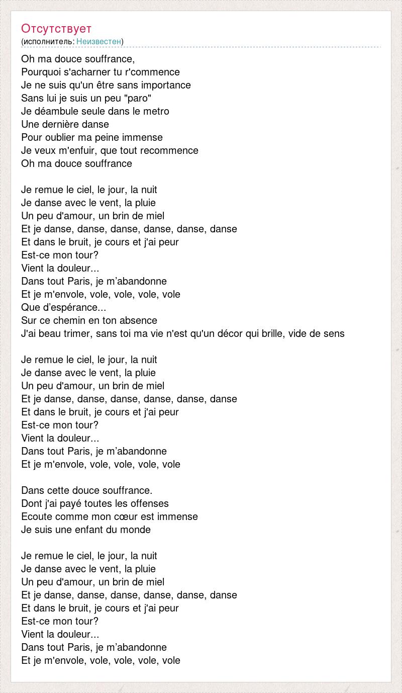 Oh ma douce souffrance, Pourquoi s'acharner tu r'commence Je ne suis qu'un être sans importance Sans lui je suis un peu "paro" Je déambule seule dans le metro Une dernière danse Pour oublier ma peine immense Je veux m'enfuir, que tout recommence Oh ma douce souffrance Je remue le ciel, le jour, la nuit Je danse avec le vent, la pluie Un peu d'amour, un brin de miel Et je danse, danse, danse, danse, danse, danse Et dans le bruit, je cours et j'ai peur Est-ce mon tour? Vient la douleur... Dans tout Paris, je m’abandonne Et je m'envole, vole, vole, vole, vole Que d’espérance... Sur ce chemin en ton absence J'ai beau trimer, sans toi ma vie n'est qu'un décor qui brille, vide de sens Je remue le ciel, le jour, la nuit Je danse avec le vent, la pluie Un peu d'amour, un brin de miel Et je danse, danse, danse, danse, danse, danse Et dans le bruit, je cours et j'ai peur Est-ce mon tour? Vient la douleur... Dans tout Paris, je m’abandonne Et je m'envole, vole, vole, vole, vole Dans cette douce souffrance. Dont j'ai payé toutes les offenses Ecoute comme mon cœur est immense Je suis une enfant du monde Je remue le ciel, le jour, la nuit Je danse avec le vent, la pluie Un peu d'amour, un brin de miel Et je danse, danse, danse, danse, danse, danse Et dans le bruit, je cours et j'ai peur Est-ce mon tour? Vient la douleur... Dans tout Paris, je m’abandonne Et je m'envole, vole, vole, vole, vole