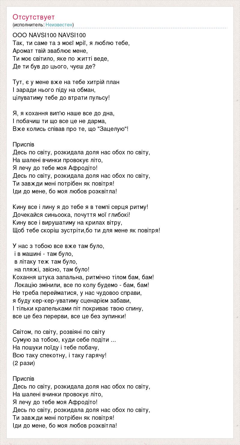 ООО NAVSI100 NAVSI100 Так, ти саме та з моєї мрії, я люблю тебе, Аромат твій зваблює мене, Ти моє світило, яке по житті веде, Де ти був до цього, чуєш де? Тут, є у мене вже на тебе хитрій план І заради нього піду на обман, цілуватиму тебе до втрати пульсу! Я, я кохання вип'ю наше все до дна, І побачиш ти що все це не дарма, Вже колись співав про те, що "Зацелую"! Приспів Десь по світу, розкидала доля нас обох по світу, На шалені вчинки провокує літо, Я лечу до тебе моя Афродіто! Десь по світу, розкидала доля нас обох по світу, Ти завжди мені потрібен як повітря! Іди до мене, бо моя любов розквітла! Кину все і лину я до тебе я в темпі серця ритму! Дочекайся синьоока, почуття мої глибокі! Кину все і вирушатиму на крилах вітру, Щоб тебе скоріш зустріти,бо ти для мене як повітря! У нас з тобою все вже там було, і в машині - там було, в літаку теж там було, на пляжі, звісно, там було! Кохання штука запальна, ритмічно тілом бам, бам! Локацію змінили, все по колу будемо - бам, бам! Не треба перейматися, у нас чудовоо справи, я буду кер-кер-уватиму сценарієм забави, І тільки крапельками піт покриває твою спину, все це без перерви, все це без зупинки! Світом, по світу, розвіяні по світу Сумую за тобою, куди себе подіти ... На пошуки поїду і тебе побачу, Всю таку спекотну, і таку гарячу! (2 рази) Приспів Десь по світу, розкидала доля нас обох по світу, На шалені вчинки провокує літо, Я лечу до тебе моя Афродіто! Десь по світу, розкидала доля нас обох по світу, Ти завжди мені потрібен як повітря! Іди до мене, бо моя любов розквітла!