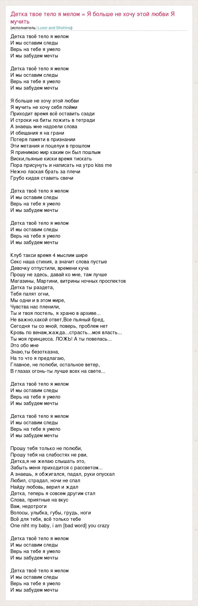 Детка твоё тело я мелом И мы оставим следы Верь на тебе я умело И мы забудем мечты Детка твоё тело я мелом И мы оставим следы Верь на тебе я умело И мы забудем мечты Я больше не хочу этой любви Я мучить не хочу себя пойми Приходит время всё оставить сзади И строки на биты ложить в тетради А знаешь мне надоели слова И обещания я на грани Потеря памяти в признании Эти метания и поцелуи в прошлом Я принимаю мир каким он был пошлым Виски,пьяные киски время тискать Пора присунуть и написать на утро kiss me Нежно лаская брать за плечи Грубо кидая ставить свечи Детка твоё тело я мелом И мы оставим следы Верь на тебе я умело И мы забудем мечты Детка твоё тело я мелом И мы оставим следы Верь на тебе я умело И мы забудем мечты Клуб такси время 4 мыслим шире Секс наша стихия, а значит слова пустые Девочку отпустили, времени куча Прошу не здесь, давай ко мне, там лучше Магазины, Мартини, витрины ночных проспектов Детка ты раздета, Тебя палят огни, Мы одни и в этом мире, Чувства нас пленили, Ты и твоя постель, я храню в архиве... Не важно,какой ответ,Все пьяный бред, Сегодня ты со мной, поверь, проблем нет Кровь по венам,жажда...страсть...моя власть... Ты моя принцесса. ЛОЖЬ! А ты повелась... Это обо мне Знаю,ты безотказна, На то что я предлагаю, Главное, не полюби, остальное ветер, В глазах огонь-ты лучше всех на свете... Детка твоё тело я мелом И мы оставим следы Верь на тебе я умело И мы забудем мечты Детка твоё тело я мелом И мы оставим следы Верь на тебе я умело И мы забудем мечты Прошу тебя только не полюби, Прошу тебя на слабостях не рви, Детка,я не желаю слышать это, Забыть меня приходится с рассветом... А знаешь, я обжигался, падал, руки опускал Любил, страдал, ночи не спал Найду любовь, верил и ждал Детка, теперь я совсем другим стал Слова, приятные на вкус Вам, недотроги Волосы, улыбка, губы, грудь, ноги Всё для тебя, всё только тебе One niht my baby, i am [bad word] you crazy Детка твоё тело я мелом И мы оставим следы Верь на тебе я умело И мы забудем мечты Детка твоё тело я мелом И мы оставим следы Верь на тебе я умело И мы забудем мечты