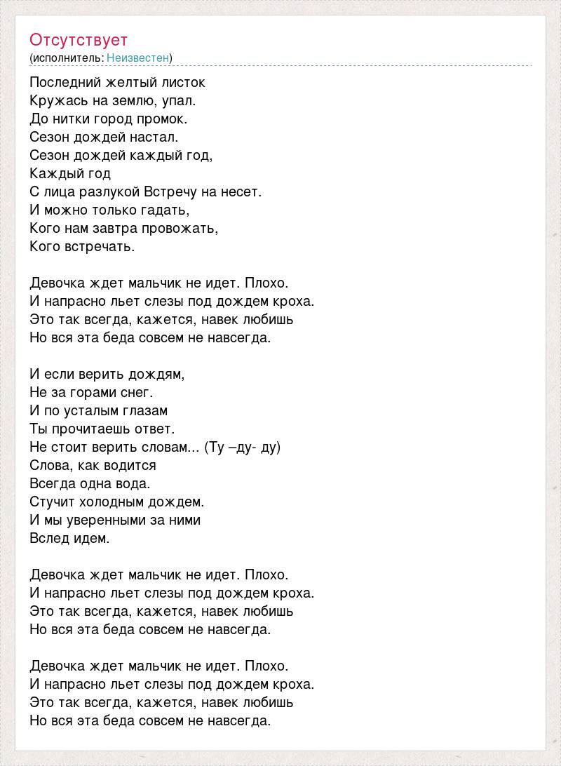 Последний желтый листок Кружась на землю, упал. До нитки город промок. Сезон дождей настал. Сезон дождей каждый год, Каждый год С лица разлукой Встречу на несет. И можно только гадать, Кого нам завтра провожать, Кого встречать. Девочка ждет мальчик не идет. Плохо. И напрасно льет слезы под дождем кроха. Это так всегда, кажется, навек любишь Но вся эта беда совсем не навсегда. И если верить дождям, Не за горами снег. И по усталым глазам Ты прочитаешь ответ. Не стоит верить словам... (Ту –ду- ду) Слова, как водится Всегда одна вода. Стучит холодным дождем. И мы уверенными за ними Вслед идем. Девочка ждет мальчик не идет. Плохо. И напрасно льет слезы под дождем кроха. Это так всегда, кажется, навек любишь Но вся эта беда совсем не навсегда. Девочка ждет мальчик не идет. Плохо. И напрасно льет слезы под дождем кроха. Это так всегда, кажется, навек любишь Но вся эта беда совсем не навсегда.
