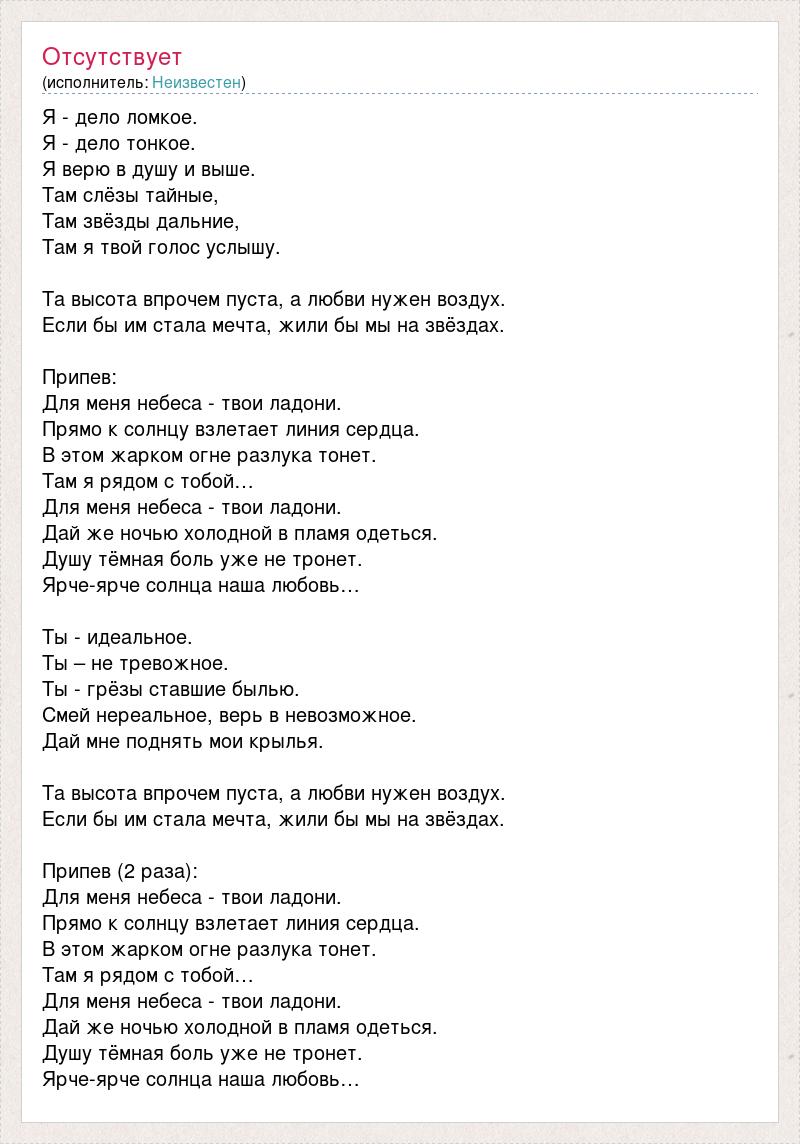 Я - дело ломкое. Я - дело тонкое. Я верю в душу и выше. Там слёзы тайные, Там звёзды дальние, Там я твой голос услышу. Та высота впрочем пуста, а любви нужен воздух. Если бы им стала мечта, жили бы мы на звёздах. Припев: Для меня небеса - твои ладони. Прямо к солнцу взлетает линия сердца. В этом жарком огне разлука тонет. Там я рядом с тобой… Для меня небеса - твои ладони. Дай же ночью холодной в пламя одеться. Душу тёмная боль уже не тронет. Ярче-ярче солнца наша любовь… Ты - идеальное. Ты – не тревожное. Ты - грёзы ставшие былью. Смей нереальное, верь в невозможное. Дай мне поднять мои крылья. Та высота впрочем пуста, а любви нужен воздух. Если бы им стала мечта, жили бы мы на звёздах. Припев (2 раза): Для меня небеса - твои ладони. Прямо к солнцу взлетает линия сердца. В этом жарком огне разлука тонет. Там я рядом с тобой… Для меня небеса - твои ладони. Дай же ночью холодной в пламя одеться. Душу тёмная боль уже не тронет. Ярче-ярче солнца наша любовь…