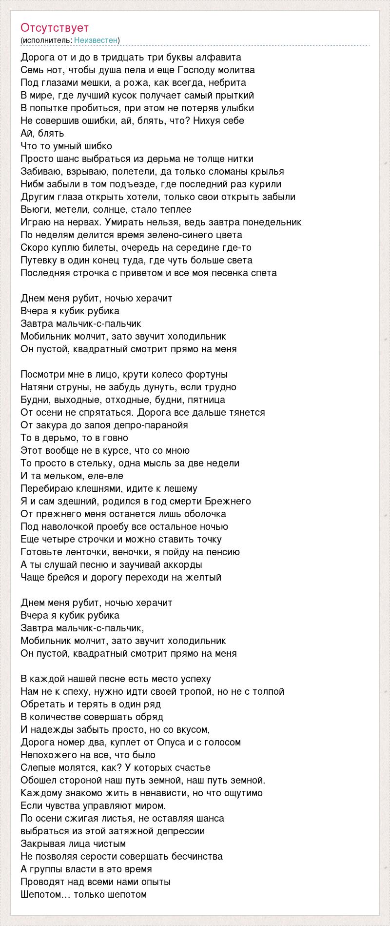 Дорога от и до в тридцать три буквы алфавита Семь нот, чтобы душа пела и еще Господу молитва Под глазами мешки, а рожа, как всегда, небрита В мире, где лучший кусок получает самый прыткий В попытке пробиться, при этом не потеряв улыбки Не совершив ошибки, ай, блять, что? Нихуя себе Ай, блять Что то умный шибко Просто шанс выбраться из дерьма не толще нитки Забиваю, взрываю, полетели, да только сломаны крылья Нибм забыли в том подъезде, где последний раз курили Другим глаза открыть хотели, только свои открыть забыли Вьюги, метели, солнце, стало теплее Играю на нервах. Умирать нельзя, ведь завтра понедельник По неделям делится время зелено-синего цвета Скоро куплю билеты, очередь на середине где-то Путевку в один конец туда, где чуть больше света Последняя строчка с приветом и все моя песенка спета Днем меня рубит, ночью херачит Вчера я кубик рубика Завтра мальчик-с-пальчик Мобильник молчит, зато звучит холодильник Он пустой, квадратный смотрит прямо на меня Посмотри мне в лицо, крути колесо фортуны Натяни струны, не забудь дунуть, если трудно Будни, выходные, отходные, будни, пятница От осени не спрятаться. Дорога все дальше тянется От закура до запоя депро-паранойя То в дерьмо, то в говно Этот вообще не в курсе, что со мною То просто в стельку, одна мысль за две недели И та мельком, еле-еле Перебираю клешнями, идите к лешему Я и сам здешний, родился в год смерти Брежнего От прежнего меня останется лишь оболочка Под наволочкой проебу все остальное ночью Еще четыре строчки и можно ставить точку Готовьте ленточки, веночки, я пойду на пенсию А ты слушай песню и заучивай аккорды Чаще брейся и дорогу переходи на желтый Днем меня рубит, ночью херачит Вчера я кубик рубика Завтра мальчик-с-пальчик, Мобильник молчит, зато звучит холодильник Он пустой, квадратный смотрит прямо на меня В каждой нашей песне есть место успеху Нам не к спеху, нужно идти своей тропой, но не с толпой Обретать и терять в один ряд В количестве совершать обряд И надежды забыть просто, но со вкусом, Дорога номер два, куплет от Опуса и с голосом Непохожего на все, что было Слепые молятся, как? У которых счастье Обошел стороной наш путь земной, наш путь земной. Каждому знакомо жить в ненависти, но что ощутимо Если чувства управляют миром. По осени сжигая листья, не оставляя шанса выбраться из этой затяжной депрессии Закрывая лица чистым Не позволяя серости совершать бесчинства А группы власти в это время Проводят над всеми нами опыты Шепотом… только шепотом