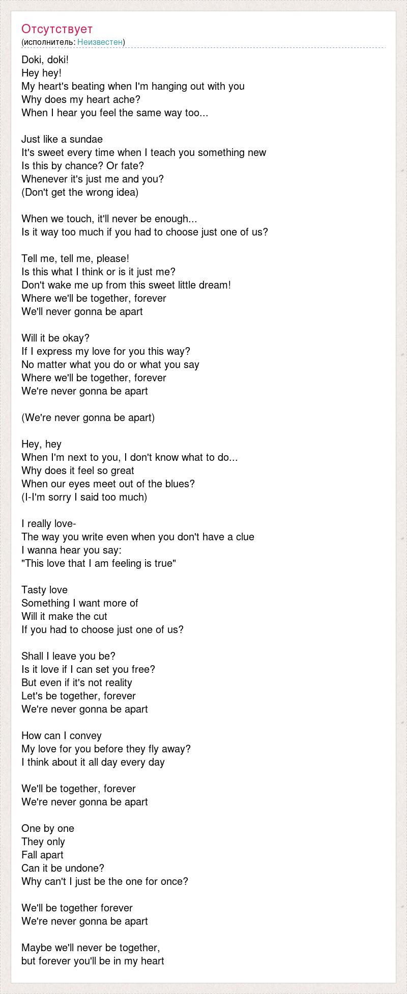 Doki, doki! Hey hey! My heart's beating when I'm hanging out with you Why does my heart ache? When I hear you feel the same way too... Just like a sundae It's sweet every time when I teach you something new Is this by chance? Or fate? Whenever it's just me and you? (Don't get the wrong idea) When we touch, it'll never be enough... Is it way too much if you had to choose just one of us? Tell me, tell me, please! Is this what I think or is it just me? Don't wake me up from this sweet little dream! Where we'll be together, forever We'll never gonna be apart Will it be okay? If I express my love for you this way? No matter what you do or what you say Where we'll be together, forever We're never gonna be apart (We're never gonna be apart) Hey, hey When I'm next to you, I don't know what to do... Why does it feel so great When our eyes meet out of the blues? (I-I'm sorry I said too much) I really love- The way you write even when you don't have a clue I wanna hear you say: "This love that I am feeling is true" Tasty love Something I want more of Will it make the cut If you had to choose just one of us? Shall I leave you be? Is it love if I can set you free? But even if it's not reality Let's be together, forever We're never gonna be apart How can I convey My love for you before they fly away? I think about it all day every day We'll be together, forever We're never gonna be apart One by one They only Fall apart Can it be undone? Why can't I just be the one for once? We'll be together forever We're never gonna be apart Maybe we'll never be together, but forever you'll be in my heart