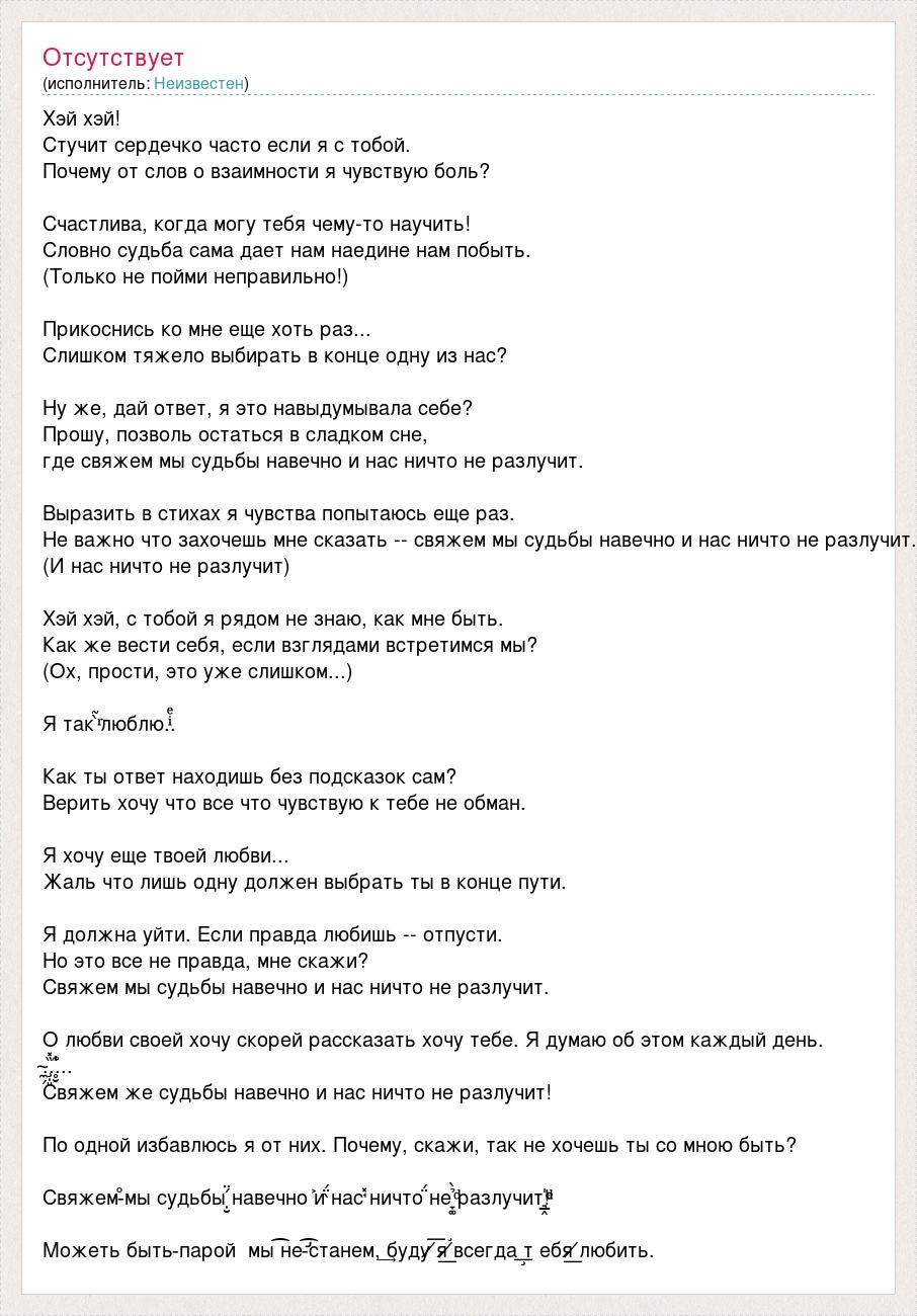 Хэй хэй! Стучит сердечко часто если я с тобой. Почему от слов о взаимности я чувствую боль? Счастлива, когда могу тебя чему-то научить! Словно судьба сама дает нам наедине нам побыть. (Только не пойми неправильно!) Прикоснись ко мне еще хоть раз... Слишком тяжело выбирать в конце одну из нас? Ну же, дай ответ, я это навыдумывала себе? Прошу, позволь остаться в сладком сне, где свяжем мы судьбы навечно и нас ничто не разлучит. Выразить в стихах я чувства попытаюсь еще раз. Не важно что захочешь мне сказать -- свяжем мы судьбы навечно и нас ничто не разлучит. (И нас ничто не разлучит) Хэй хэй, с тобой я рядом не знаю, как мне быть. Как же вести себя, если взглядами встретимся мы? (Ох, прости, это уже слишком...) Я ͏т̧̙̼̞ͫ̿̐а̺̠̂ͭк̳̼̝̎͌̽͢ ͬ̀͂лю̬ͪблͮ͌юͩ̈̒.ͥͤ. Как ты ответ находишь без подсказок сам? Верить хочу что все что чувствую к тебе не обман. Я хочу еще твоей любви... Жаль что лишь одну должен выбрать ты в конце пути. Я должна уйти. Если правда любишь -- отпусти. Но это все не правда, мне скажи? Свяжем мы судьбы навечно и нас ничто не разлучит. О любви своей хочу скорей рассказать хочу тебе. Я думаю об этом каждый день. .̴̼̗.̧̣͈̏̽.̥̮͊̔.. Свяжем же судьбы навечно и нас ничто не разлучит! По одной избавлюсь я от них. Почему, скажи, так не хочешь ты со мною быть? С͍̘в̆ͨяж̦͓̗ем ̵̊м͔̩̳ыͧ с̣͊̀у͇̭̃͌͢д̠̳̼̽͋̚ь͝б̰ы͒̊ ̣̮́̈н̛̜̦͖̈́ͦͧа͢ͅв̢͔ͩе̣̤̝ͣ͆̀͞чно̪ ͐и ̖̈́н̛͙ͫас ̘̽н͖̤̀̌и̺̗ч̖̳͂ͪт͉̱͉̋̌̈о͉ ̈́н̘ͬе̲̄ ̞͚ͩ̉̀р͠а̦͉з̺͠лу̛̹̪ч̛ит͏̞̖ͅ!͉̭̲ͩ̍ͤ М̴͡ож̵̡̧еть б͜ыть͜͜ ̵п̸а̕р͠о̢͞й ҉м̢ы ͡н͡е ̵̡͡стане̢̛͟м, ͢б̢͜͝у̵̕͞ду̕͘ ̸͞я͞ ̸̛͟вс̵͘е̕͘͝гда̧̧ ̧͟т҉ебя ̸͟люб̵̕и͜͞ть̵̕͜.