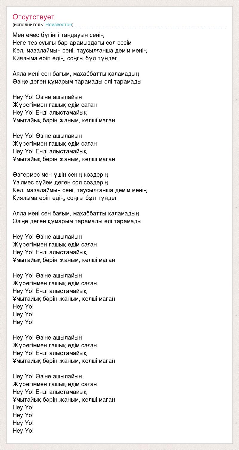 Мен емес бүгінгі таңдауын сенің Неге тез суығы бар арамыздағы сол сезім Кел, мазалаймын сені, таусылғанша демім менің Қиялыма еріп едің, соңғы бұл түндегі Аяла мені сен бағым, махаббатты қаламадың Өзіңе деген құмарым тарамады әлі тарамады Hey Yo! Өзіне ашылайын Жүрегіммен ғашық едім саған Hey Yo! Енді алыстамайық Ұмытайық бәрің жаным, келші маған Hey Yo! Өзіне ашылайын Жүрегіммен ғашық едім саған Hey Yo! Енді алыстамайық Ұмытайық бәрің жаным, келші маған Өзгермес мен үшін сенің көздерің Үзілмес сүйем деген сол сөздерің Кел, мазалаймын сені, таусылғанша демім менің Қиялыма еріп едің, соңғы бұл түндегі Аяла мені сен бағым, махаббатты қаламадың Өзіңе деген құмарым тарамады әлі тарамады Hey Yo! Өзіне ашылайын Жүрегіммен ғашық едім саған Hey Yo! Енді алыстамайық Ұмытайық бәрің жаным, келші маған Hey Yo! Өзіне ашылайын Жүрегіммен ғашық едім саған Hey Yo! Енді алыстамайық Ұмытайық бәрің жаным, келші маған Hey Yo! Hey Yo! Hey Yo! Hey Yo! Өзіне ашылайын Жүрегіммен ғашық едім саған Hey Yo! Енді алыстамайық Ұмытайық бәрің жаным, келші маған Hey Yo! Өзіне ашылайын Жүрегіммен ғашық едім саған Hey Yo! Енді алыстамайық Ұмытайық бәрің жаным, келші маған Hey Yo! Hey Yo! Hey Yo! Hey Yo!