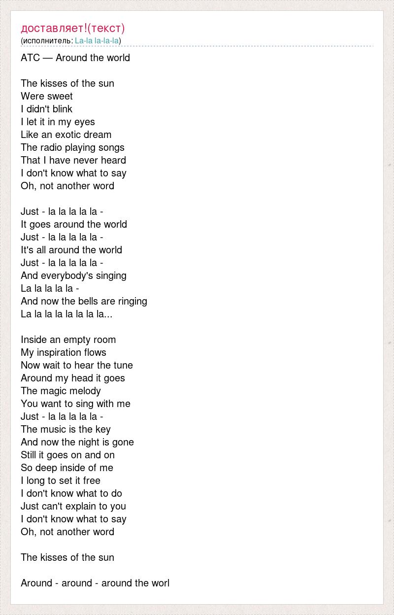 ATC — Around the world The kisses of the sun Were sweet I didn't blink I let it in my eyes Like an exotic dream The radio playing songs That I have never heard I don't know what to say Oh, not another word Just - la la la la la - It goes around the world Just - la la la la la - It's all around the world Just - la la la la la - And everybody's singing La la la la la - And now the bells are ringing La la la la la la la la... Inside an empty room My inspiration flows Now wait to hear the tune Around my head it goes The magic melody You want to sing with me Just - la la la la la - The music is the key And now the night is gone Still it goes on and on So deep inside of me I long to set it free I don't know what to do Just can't explain to you I don't know what to say Oh, not another word The kisses of the sun Around - around - around the worl