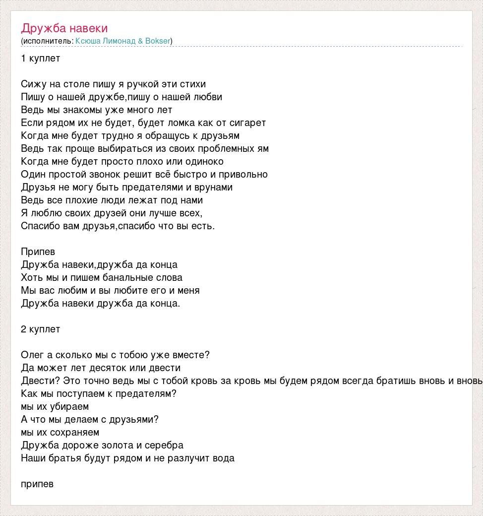 1 куплет Сижу на столе пишу я ручкой эти стихи Пишу о нашей дружбе,пишу о нашей любви Ведь мы знакомы уже много лет Если рядом их не будет, будет ломка как от сигарет Когда мне будет трудно я обращусь к друзьям Ведь так проще выбираться из своих проблемных ям Когда мне будет просто плохо или одиноко Один простой звонок решит всё быстро и привольно Друзья не могу быть предателями и врунами Ведь все плохие люди лежат под нами Я люблю своих друзей они лучше всех, Спасибо вам друзья,спасибо что вы есть. Припев Дружба навеки,дружба да конца Хоть мы и пишем банальные слова Мы вас любим и вы любите его и меня Дружба навеки дружба да конца. 2 куплет Олег а сколько мы с тобою уже вместе? Да может лет десяток или двести Двести? Это точно ведь мы с тобой кровь за кровь мы будем рядом всегда братишь вновь и вновь Как мы поступаем к предателям? мы их убираем А что мы делаем с друзьями? мы их сохраняем Дружба дороже золота и серебра Наши братья будут рядом и не разлучит вода припев