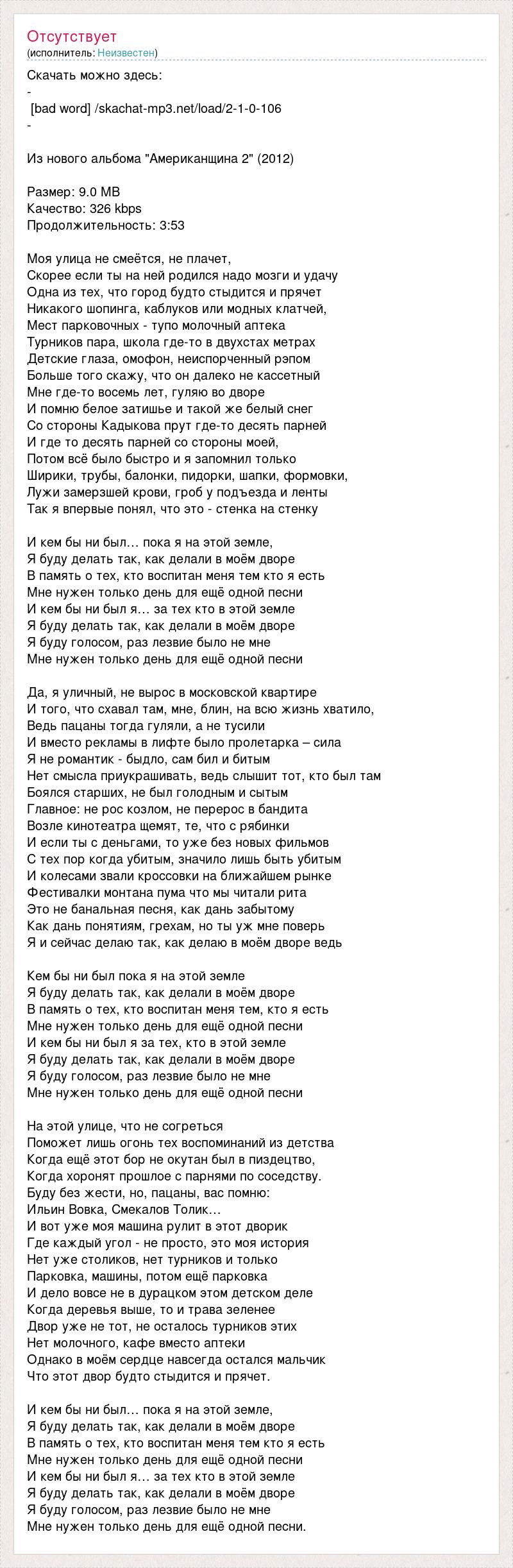 Скачать можно здесь: - [bad word] /skachat-mp3.net/load/2-1-0-106 - Из нового альбома "Американщина 2" (2012) Размер: 9.0 MB Качество: 326 kbps Продолжительность: 3:53 Моя улица не смеётся, не плачет, Скорее если ты на ней родился надо мозги и удачу Одна из тех, что город будто стыдится и прячет Никакого шопинга, каблуков или модных клатчей, Мест парковочных - тупо молочный аптека Турников пара, школа где-то в двухстах метрах Детские глаза, омофон, неиспорченный рэпом Больше того скажу, что он далеко не кассетный Мне где-то восемь лет, гуляю во дворе И помню белое затишье и такой же белый снег Со стороны Кадыкова прут где-то десять парней И где то десять парней со стороны моей, Потом всё было быстро и я запомнил только Ширики, трубы, балонки, пидорки, шапки, формовки, Лужи замерзшей крови, гроб у подъезда и ленты Так я впервые понял, что это - стенка на стенку И кем бы ни был… пока я на этой земле, Я буду делать так, как делали в моём дворе В память о тех, кто воспитан меня тем кто я есть Мне нужен только день для ещё одной песни И кем бы ни был я… за тех кто в этой земле Я буду делать так, как делали в моём дворе Я буду голосом, раз лезвие было не мне Мне нужен только день для ещё одной песни Да, я уличный, не вырос в московской квартире И того, что схавал там, мне, блин, на всю жизнь хватило, Ведь пацаны тогда гуляли, а не тусили И вместо рекламы в лифте было пролетарка – сила Я не романтик - быдло, сам бил и битым Нет смысла приукрашивать, ведь слышит тот, кто был там Боялся старших, не был голодным и сытым Главное: не рос козлом, не перерос в бандита Возле кинотеатра щемят, те, что с рябинки И если ты с деньгами, то уже без новых фильмов С тех пор когда убитым, значило лишь быть убитым И колесами звали кроссовки на ближайшем рынке Фестивалки монтана пума что мы читали рита Это не банальная песня, как дань забытому Как дань понятиям, грехам, но ты уж мне поверь Я и сейчас делаю так, как делаю в моём дворе ведь Кем бы ни был пока я на этой земле Я буду делать так, как делали в моём дворе В память о тех, кто воспитан меня тем, кто я есть Мне нужен только день для ещё одной песни И кем бы ни был я за тех, кто в этой земле Я буду делать так, как делали в моём дворе Я буду голосом, раз лезвие было не мне Мне нужен только день для ещё одной песни На этой улице, что не согреться Поможет лишь огонь тех воспоминаний из детства Когда ещё этот бор не окутан был в пиздецтво, Когда хоронят прошлое с парнями по соседству. Буду без жести, но, пацаны, вас помню: Ильин Вовка, Смекалов Толик… И вот уже моя машина рулит в этот дворик Где каждый угол - не просто, это моя история Нет уже столиков, нет турников и только Парковка, машины, потом ещё парковка И дело вовсе не в дурацком этом детском деле Когда деревья выше, то и трава зеленее Двор уже не тот, не осталось турников этих Нет молочного, кафе вместо аптеки Однако в моём сердце навсегда остался мальчик Что этот двор будто стыдится и прячет. И кем бы ни был… пока я на этой земле, Я буду делать так, как делали в моём дворе В память о тех, кто воспитан меня тем кто я есть Мне нужен только день для ещё одной песни И кем бы ни был я… за тех кто в этой земле Я буду делать так, как делали в моём дворе Я буду голосом, раз лезвие было не мне Мне нужен только день для ещё одной песни.