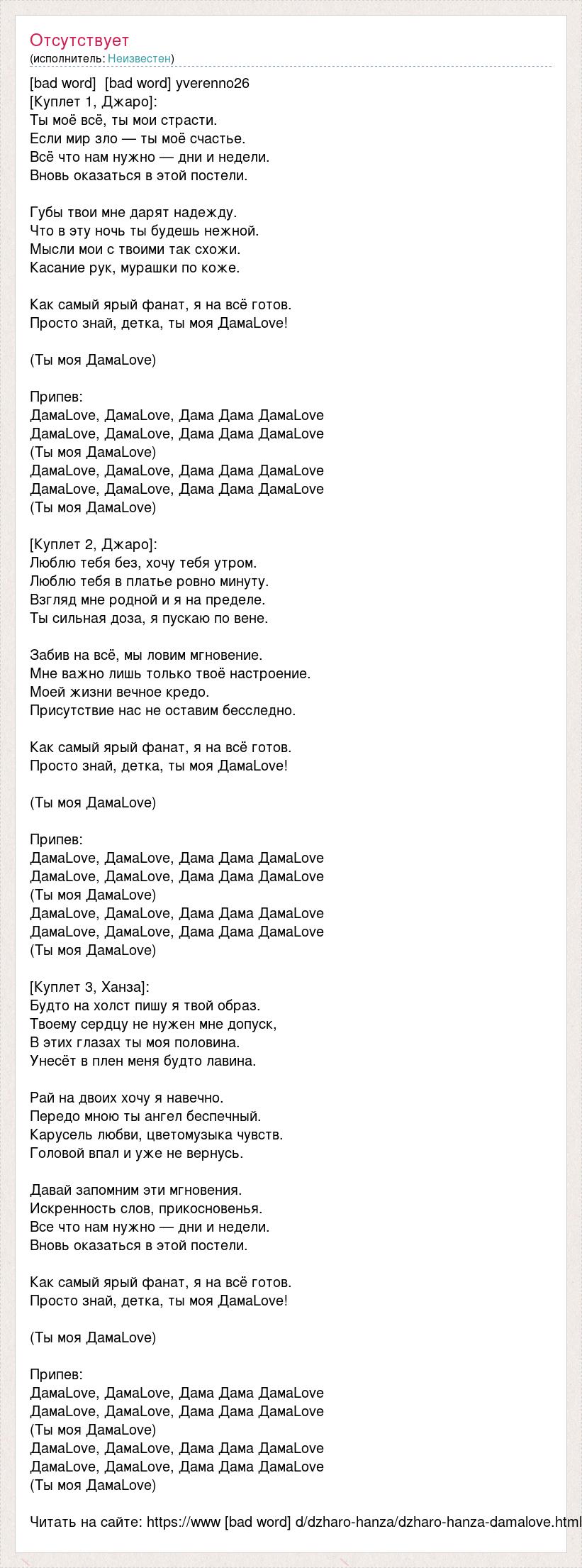 [bad word] [bad word] yverenno26 [Куплет 1, Джаро]: Ты моё всё, ты мои страсти. Если мир зло — ты моё счастье. Всё что нам нужно — дни и недели. Вновь оказаться в этой постели. Губы твои мне дарят надежду. Что в эту ночь ты будешь нежной. Мысли мои с твоими так схожи. Касание рук, мурашки по коже. Как самый ярый фанат, я на всё готов. Просто знай, детка, ты моя ДамаLove! (Ты моя ДамаLove) Припев: ДамаLove, ДамаLove, Дама Дама ДамаLove ДамаLove, ДамаLove, Дама Дама ДамаLove (Ты моя ДамаLove) ДамаLove, ДамаLove, Дама Дама ДамаLove ДамаLove, ДамаLove, Дама Дама ДамаLove (Ты моя ДамаLove) [Куплет 2, Джаро]: Люблю тебя без, хочу тебя утром. Люблю тебя в платье ровно минуту. Взгляд мне родной и я на пределе. Ты сильная доза, я пускаю по вене. Забив на всё, мы ловим мгновение. Мне важно лишь только твоё настроение. Моей жизни вечное кредо. Присутствие нас не оставим бесследно. Как самый ярый фанат, я на всё готов. Просто знай, детка, ты моя ДамаLove! (Ты моя ДамаLove) Припев: ДамаLove, ДамаLove, Дама Дама ДамаLove ДамаLove, ДамаLove, Дама Дама ДамаLove (Ты моя ДамаLove) ДамаLove, ДамаLove, Дама Дама ДамаLove ДамаLove, ДамаLove, Дама Дама ДамаLove (Ты моя ДамаLove) [Куплет 3, Ханза]: Будто на холст пишу я твой образ. Твоему сердцу не нужен мне допуск, В этих глазах ты моя половина. Унесёт в плен меня будто лавина. Рай на двоих хочу я навечно. Передо мною ты ангел беспечный. Карусель любви, цветомузыка чувств. Головой впал и уже не вернусь. Давай запомним эти мгновения. Искренность слов, прикосновенья. Все что нам нужно — дни и недели. Вновь оказаться в этой постели. Как самый ярый фанат, я на всё готов. Просто знай, детка, ты моя ДамаLove! (Ты моя ДамаLove) Припев: ДамаLove, ДамаLove, Дама Дама ДамаLove ДамаLove, ДамаLove, Дама Дама ДамаLove (Ты моя ДамаLove) ДамаLove, ДамаLove, Дама Дама ДамаLove ДамаLove, ДамаLove, Дама Дама ДамаLove (Ты моя ДамаLove) Читать на сайте: https://www [bad word] d/dzharo-hanza/dzharo-hanza-damalove.html